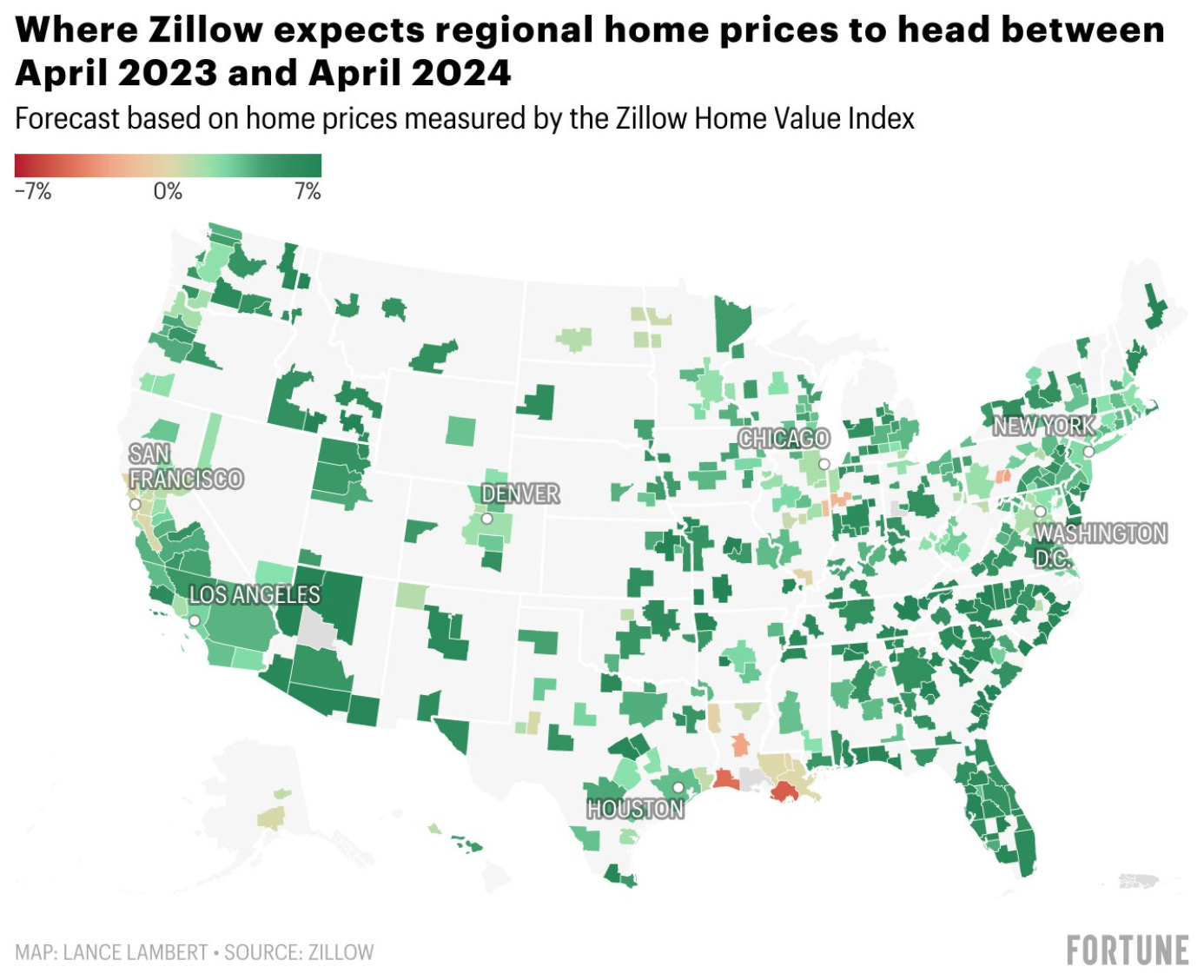 Here is where Zillow expects regional home prices to head moving forward. Their model predicts rising prices in 390 of 400 largest U.S. housing markets. That’s a lot of green!
