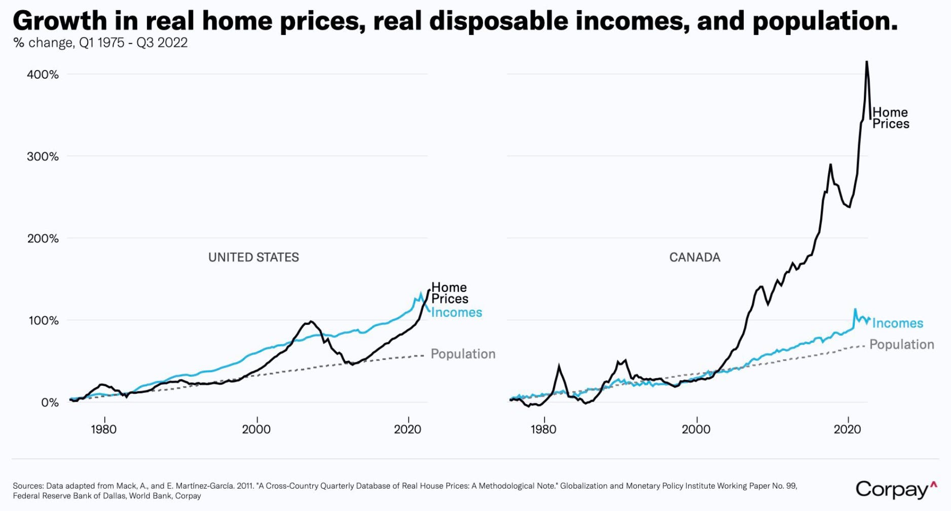 Remember Canada has lower wages than the United States. The U.S. has stronger employment. As incomes rise, housing prices rise.
