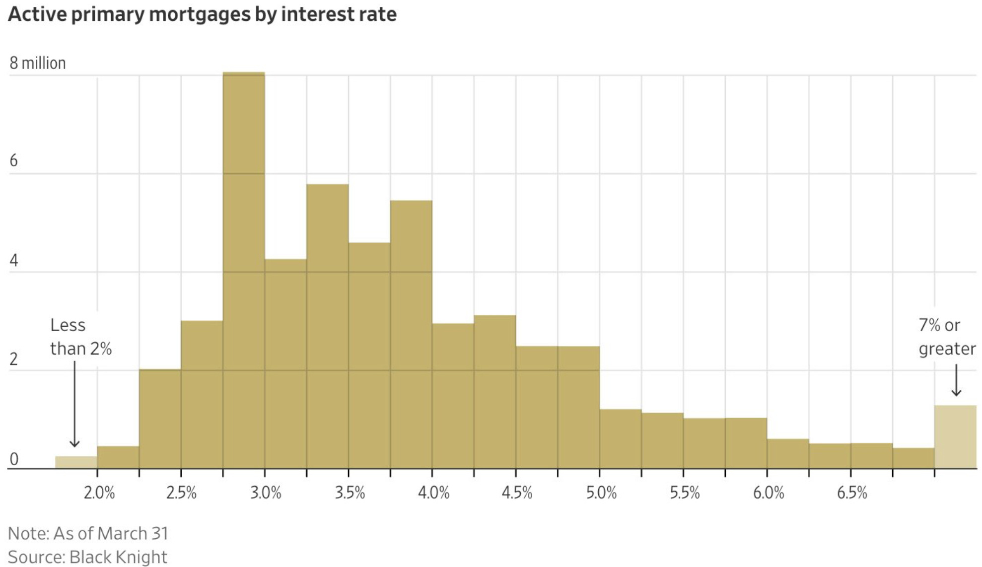 But how can this be? As I write this, the 30-year fixed mortgage sits at 6.97%. On December 30, 2021 that rate was 3.11%. To think of all the people who have locked in 30-year mortgage rates near those levels. In fact, it’s a large majority of active mortgages as the chart below shows.