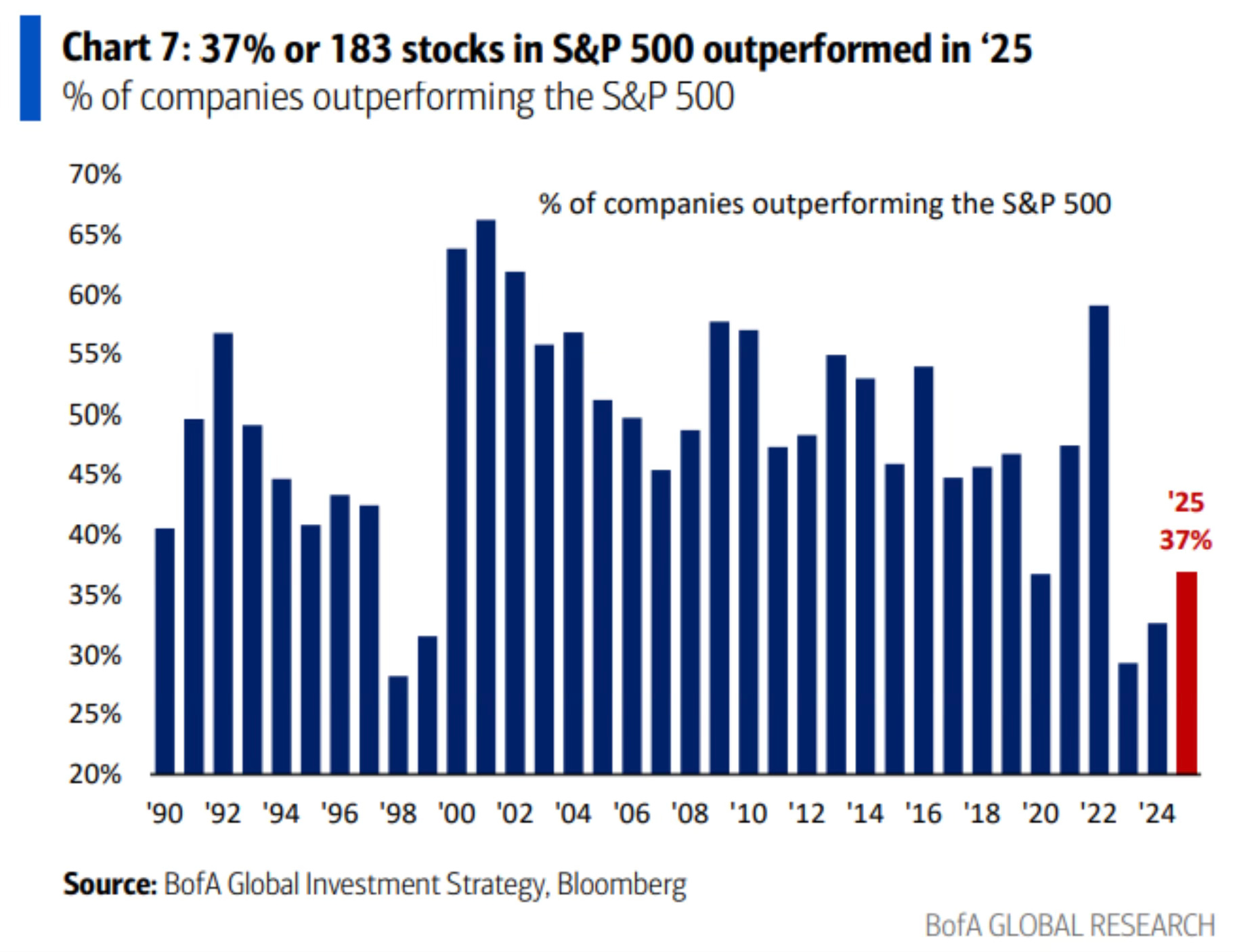 Only 37% or 183 stocks have outperformed the S&P 500 so far in 2025.