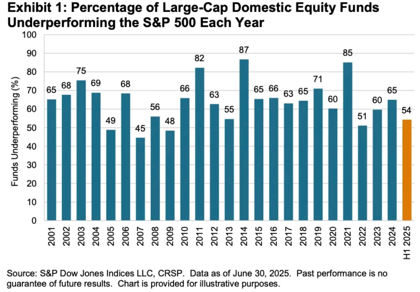 54.3% of U.S. large-cap equity fund managers underperformed the S&P 500 in the first six months of 2025 according to S&P Dow Jones Indices (SPDJI). In 2024, it was 65%.