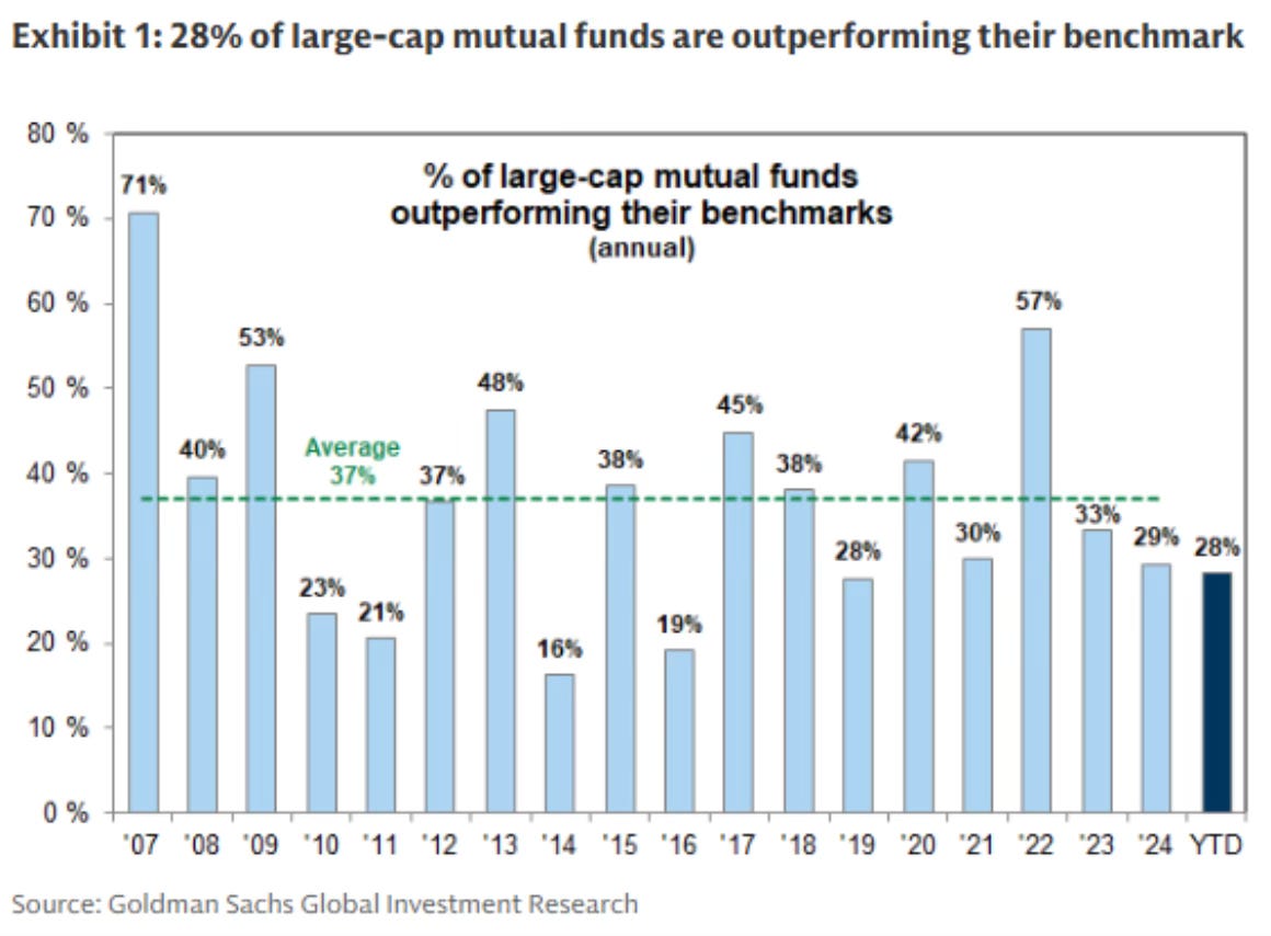 Only 28% of large cap mutual funds are ahead of their benchmark this year.