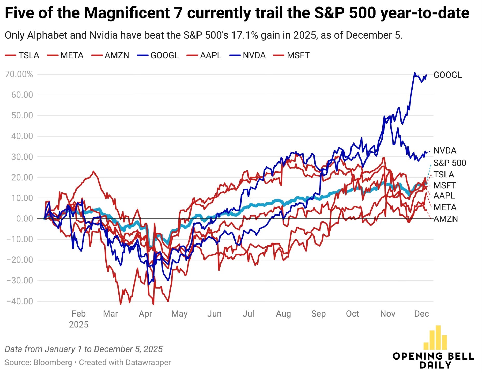 Five of the seven stocks are trailing the S&P 500 in 2025. Only Nvidia and Google are beating it.