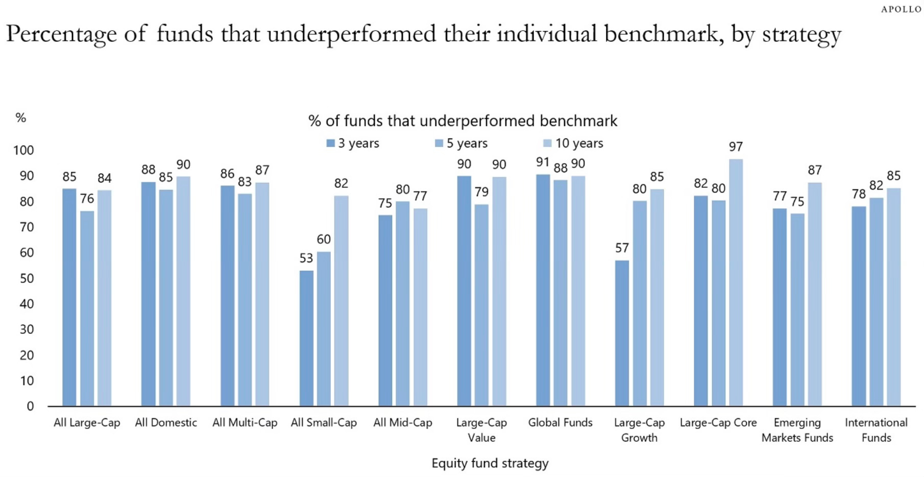 According to Apollo, more than 80% of active managers in public markets underperform their index.