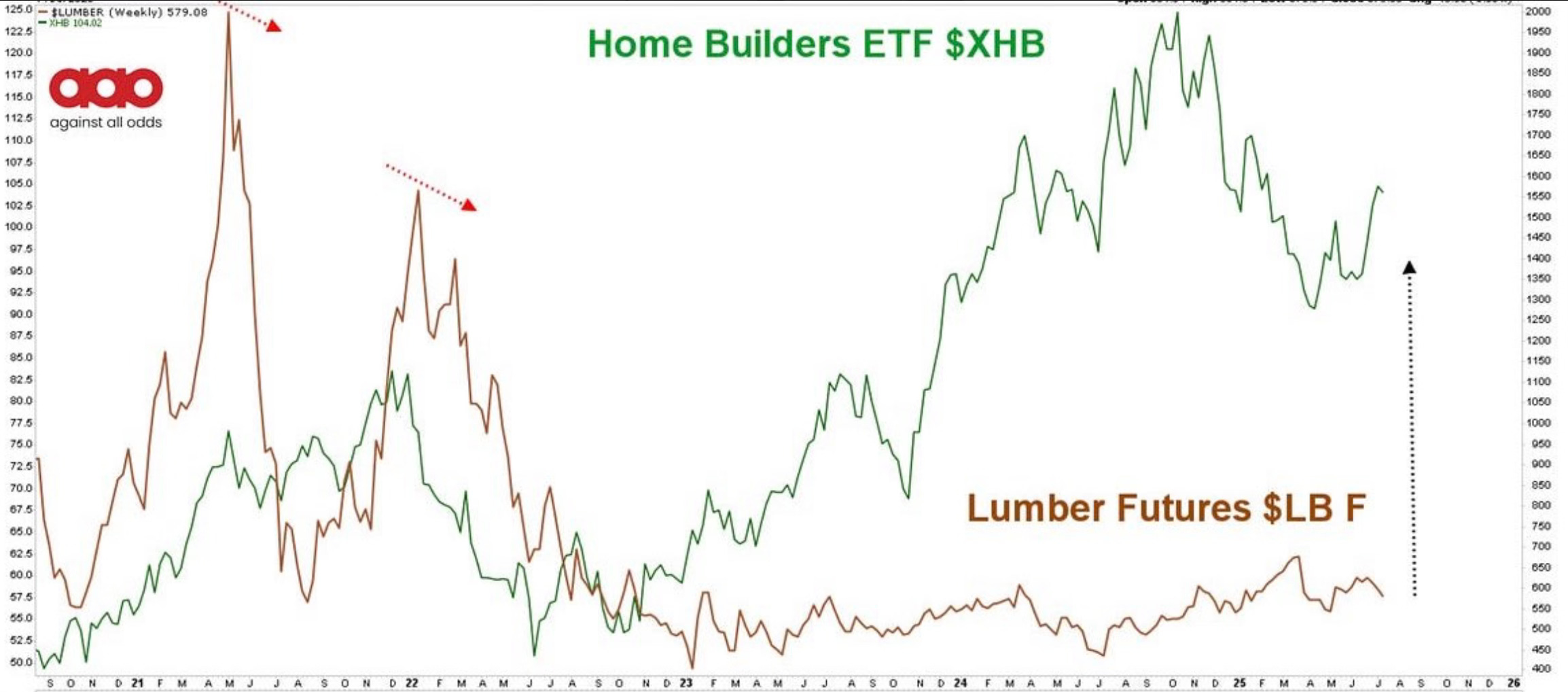 Home builders have already started to move. They bounced off the low and are now surprisingly above the 200-day. It’s interesting though how in this chart they looked at lumber. It hasn’t moved and has been going in the opposite direction. I can’t envision that lasting.