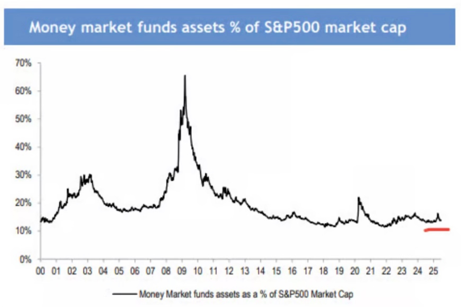 Yes, that $7.4 trillion sounds like a lot. But it still remains a tiny percentage of total assets. You have to keep that amount in context. I like how this chart shows money market funds assets as a percentage of the S&P 500 market cap.