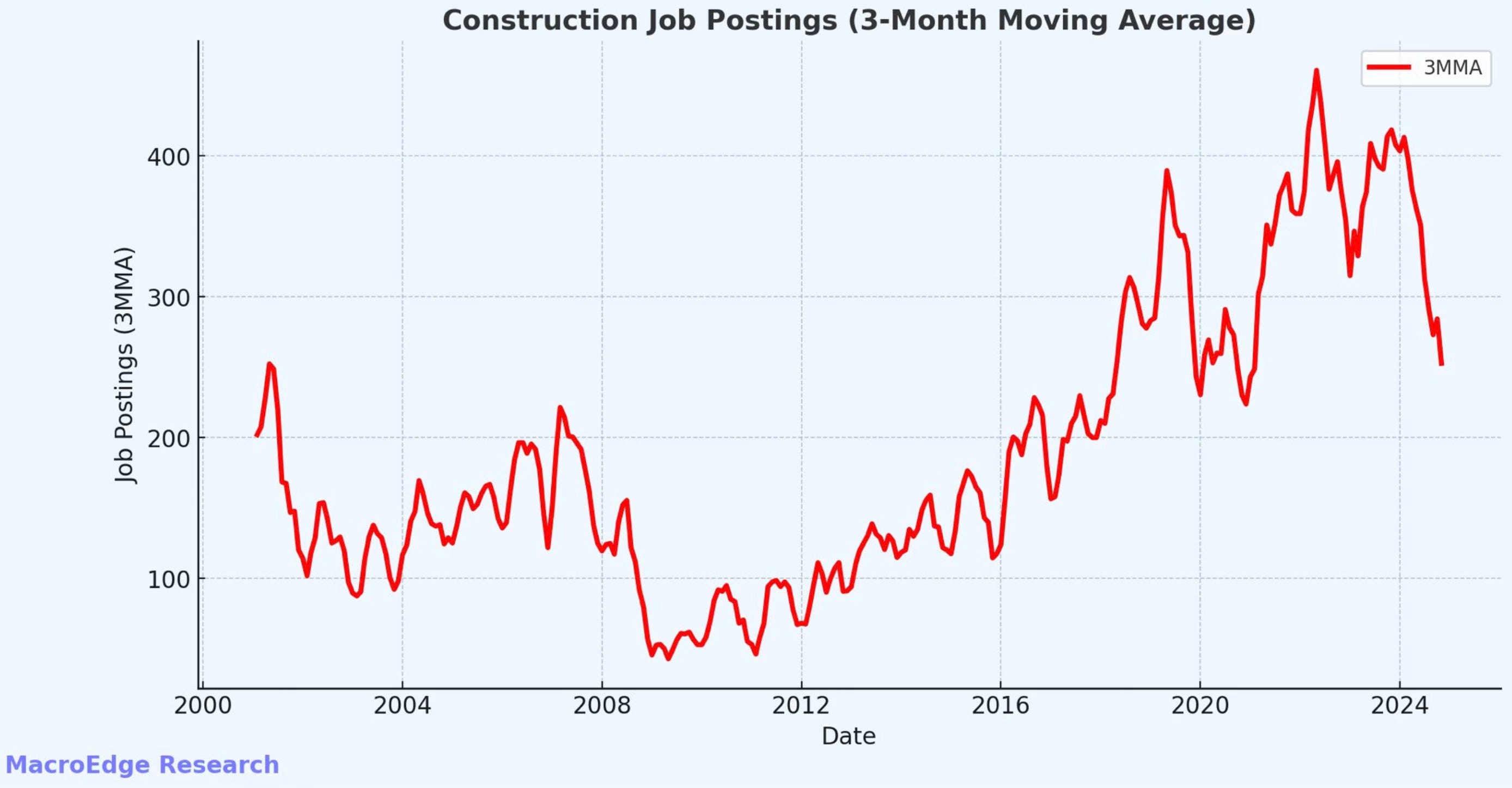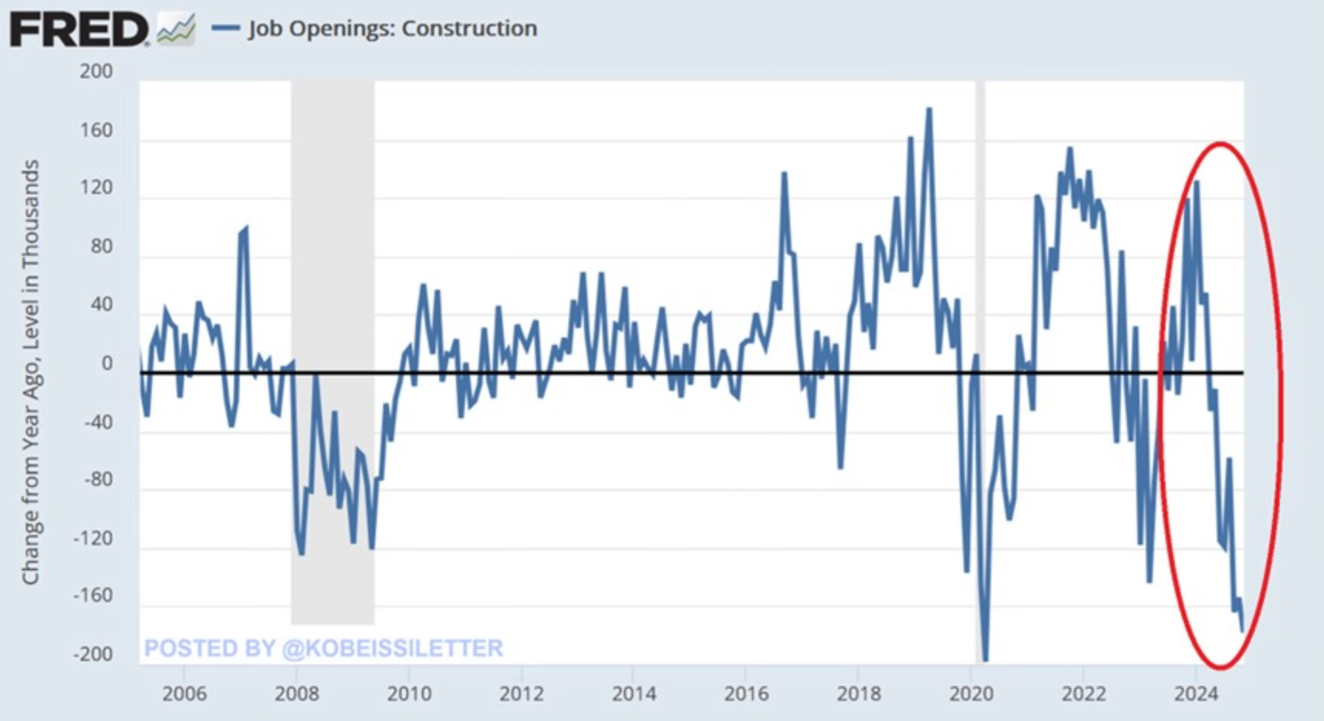 You now exactly where this is then leading for construction sector jobs. This real estate slowdown is now reflected in these two charts that show construction job openings and postings. They’re about back to 2020 levels.