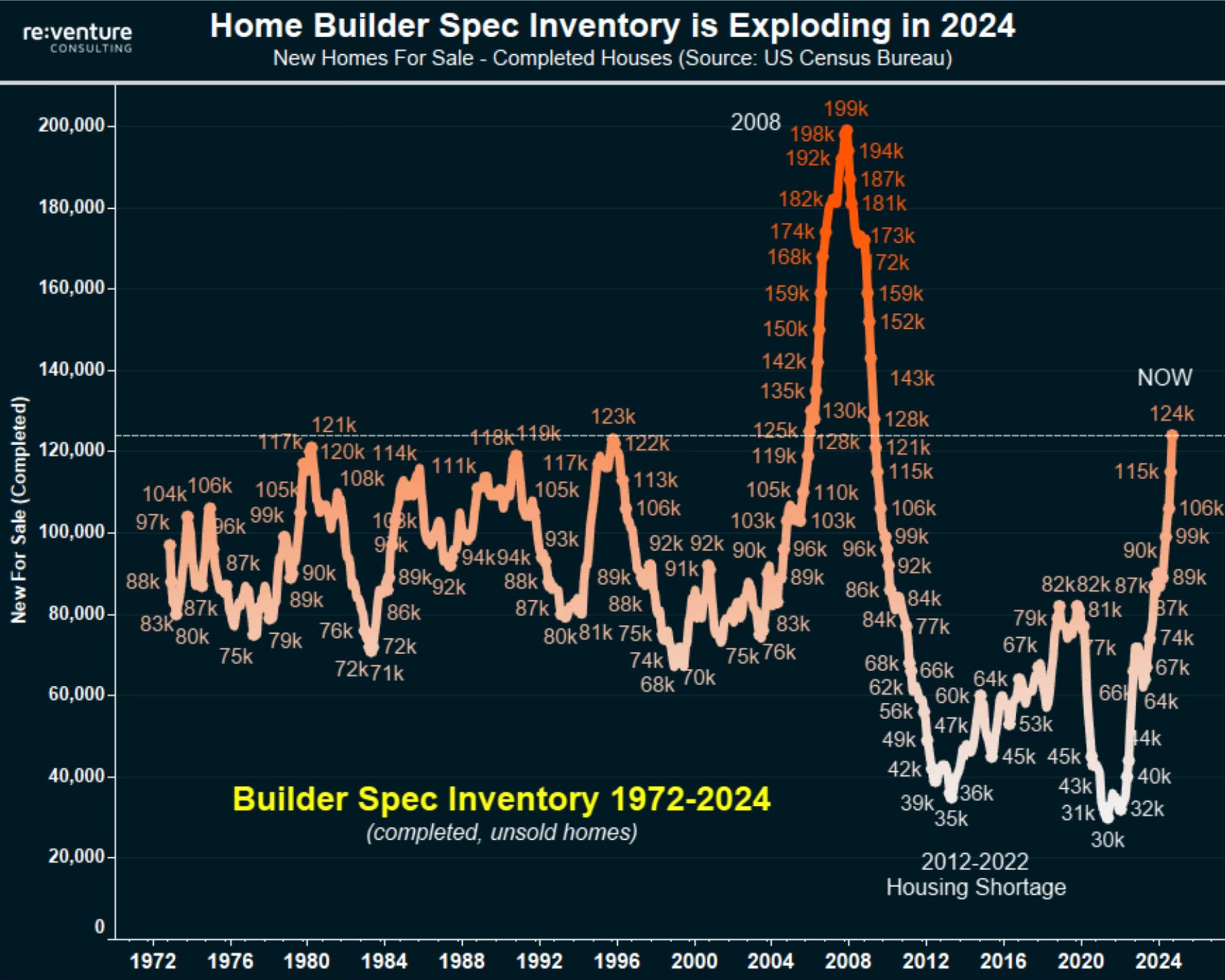 Home builder spec inventory, which are homes that get built without a buyer ready to buy it are at the 2nd highest level going back to 1972. Only the 2008 housing bubble had a higher inventory than today.