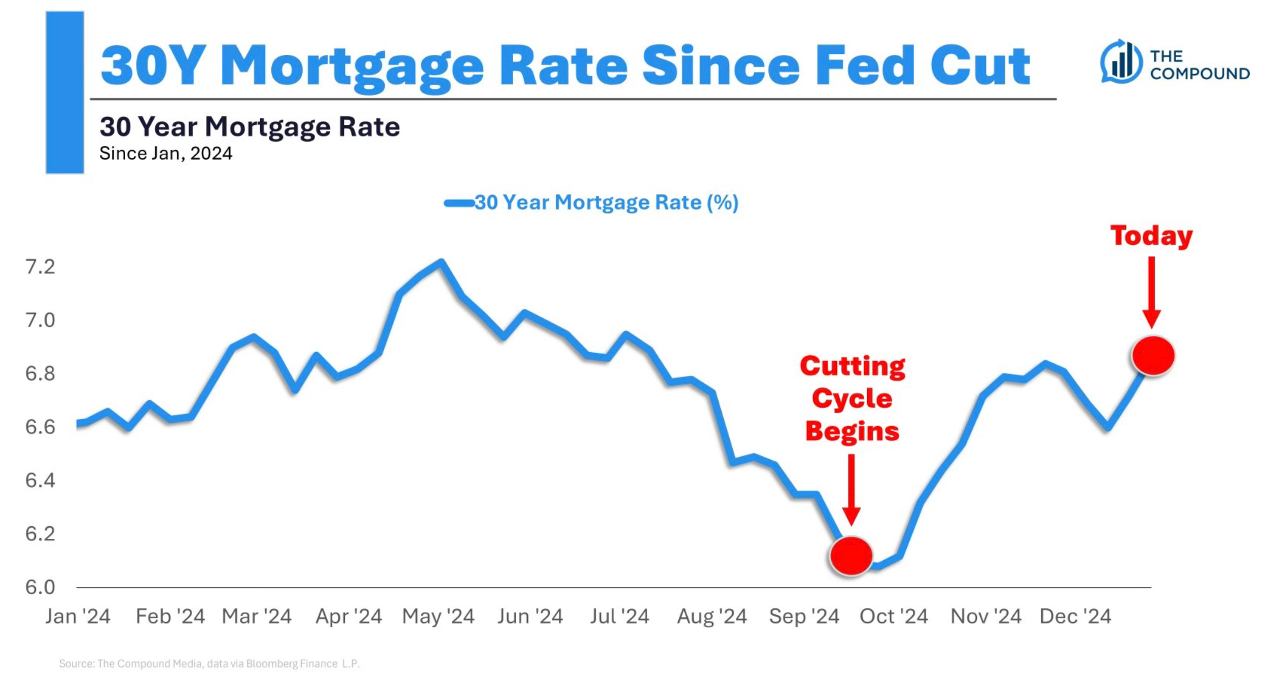 Take a look at this chart of the 30-year mortgage but notice what has happened to rates since the Fed started to cut.