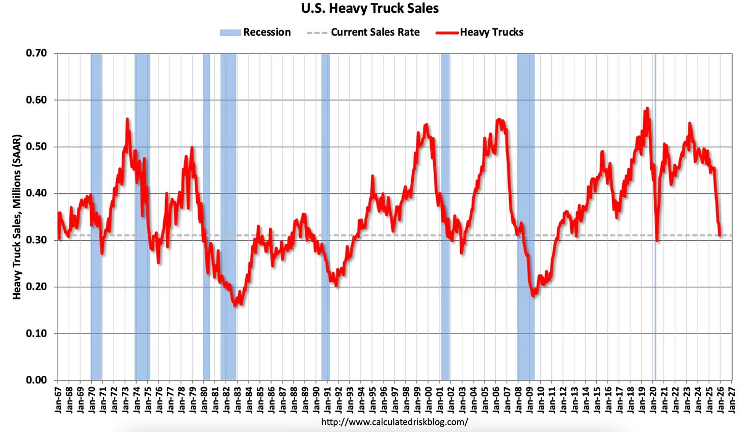 Heavy truck sales, which tend to roll over ahead of recessions, continue to decline. These levels are clearly noteworthy. There aren’t many charts or data points that concern me right now, but this is one I continue to watch closely.