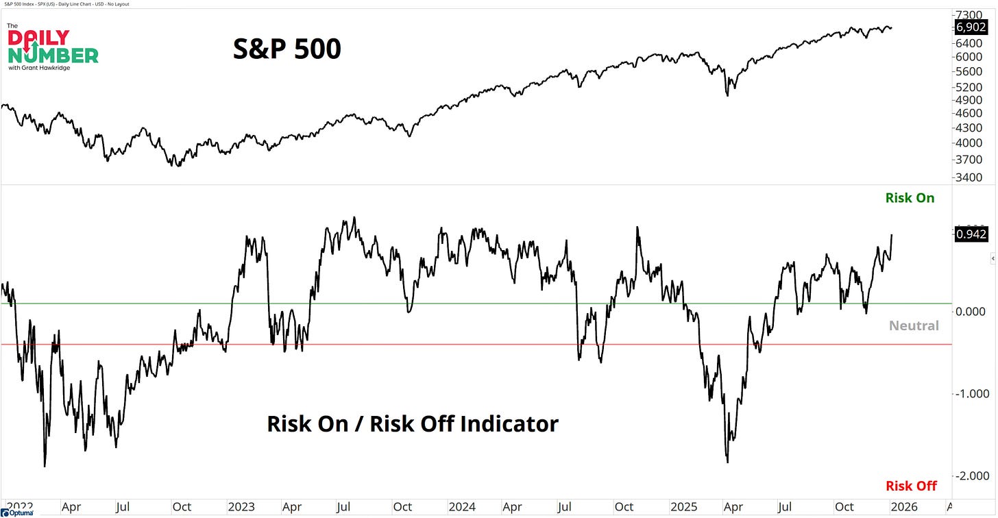 The everything rally should indicate that risk appetite is still strong. Grant Hawkridge shows in his risk Risk-On Risk-Off indicator exactly that. In fact, it looks to be strengthening. His indicator is at the highest level since November 2024.
