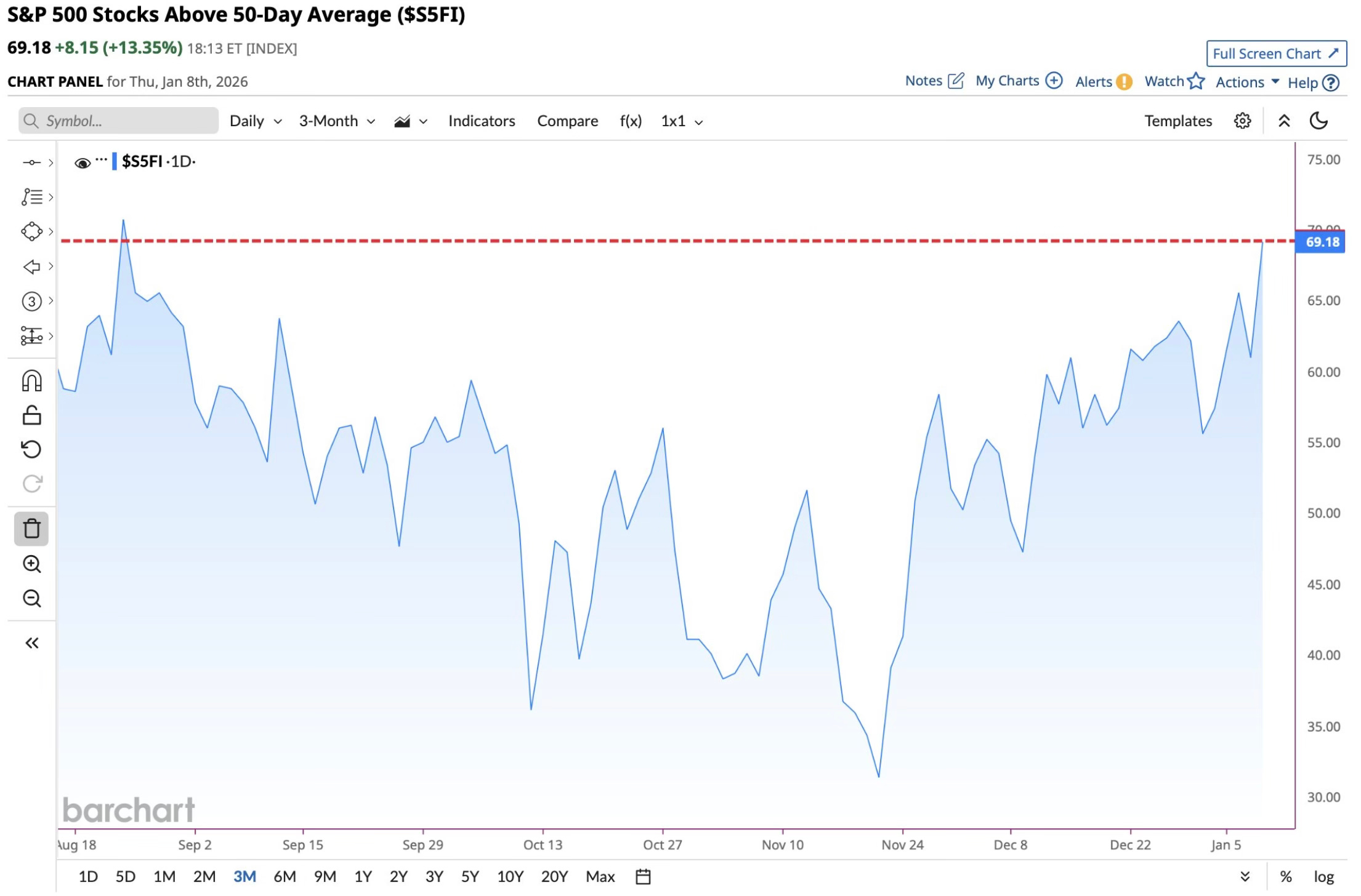 69% of S&P 500 stocks are now trading above their 50-day moving average. That’s the most since August.
