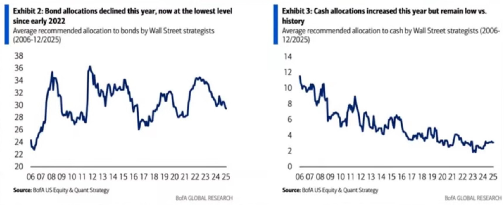 As equities continue to rally, allocations to bonds and cash keep sliding.