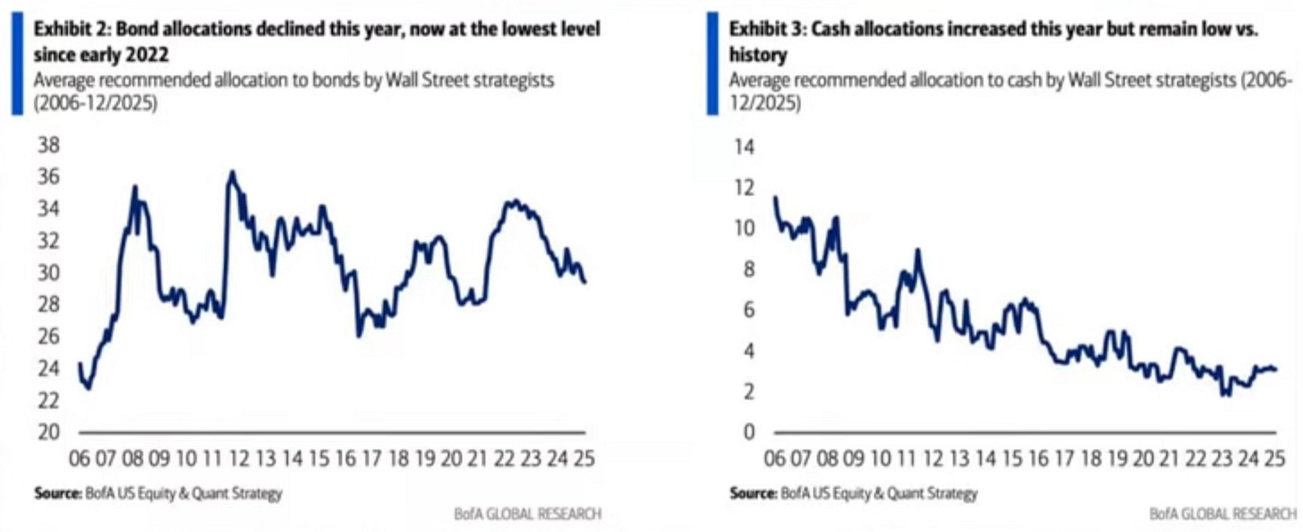 Bond allocations are at their lowest level since early 2022. Cash allocations have ticked up slightly but remain historically low. With stocks doing what they’ve been doing, it’s hard to blame investors.