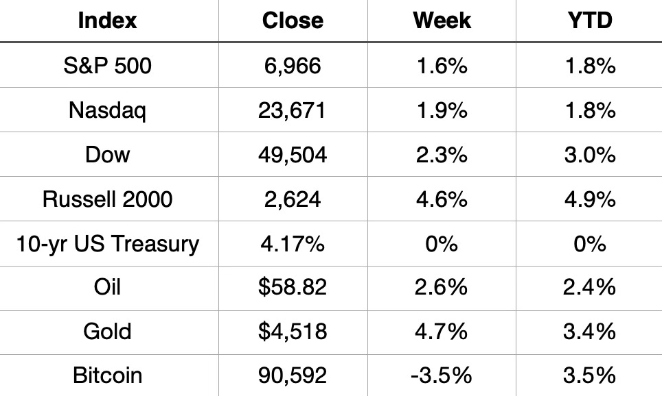 The Dow and S&P 500 closed Friday at new all-time highs, capping a week where every major index finished higher. It has been a historic start to 2026, with the S&P 500 already logging two record breaking sessions in its first full week.