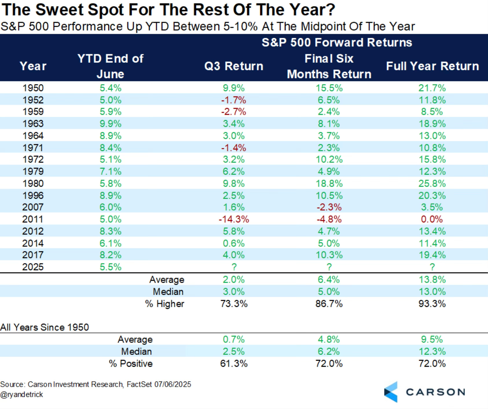 When the S&P 500 is up between 5-10% at the midway point. The final six months are higher 13 out of 15 times. The full year is up 14 of 15 times.