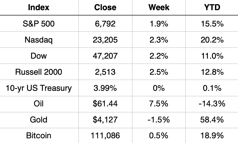 The better inflation data helped lift the stock market to its third positive week in the past four for the major indices. For the first time ever, the Dow crossed 47,000. The Dow, S&P 500, and Nasdaq all ended the week at new all-time highs.