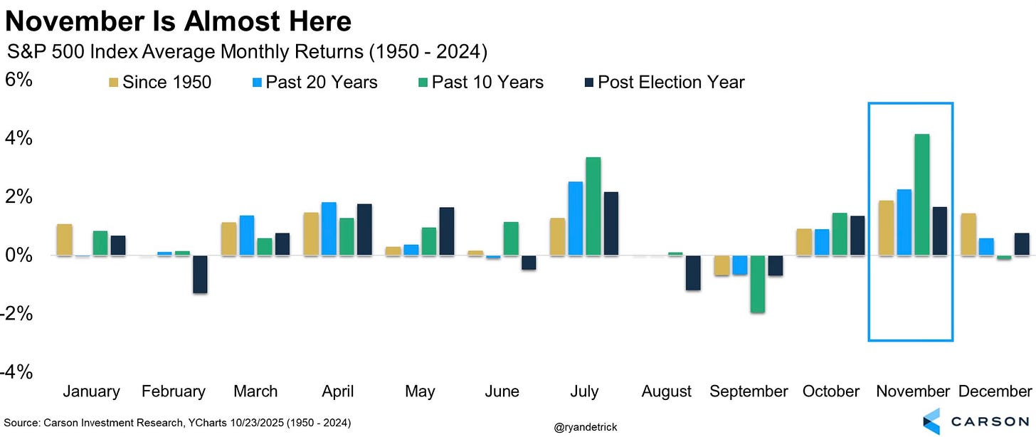 The best month of the year for stocks is upcoming. November is historically the best month for the S&P 500 since 1950. Even over the past 10 years, it has also been the best month.