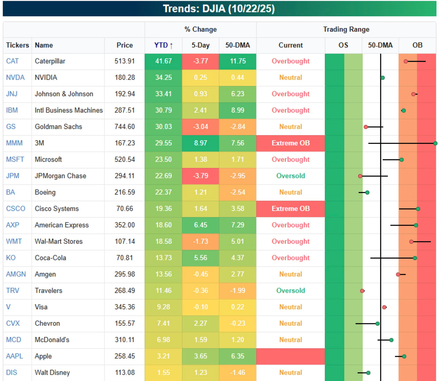 20 of the 30 Dow stocks are up YTD. Caterpillar and Nvidia lead the way. Apple and Disney are the biggest laggards.