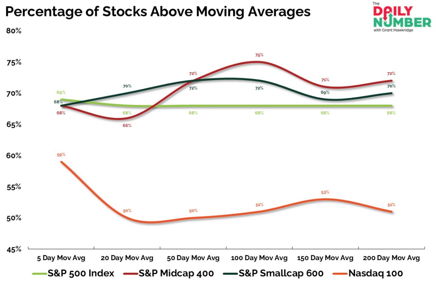 The divergence is even more stark when you zoom in: only 51% of Nasdaq stocks are trading above their 200-day moving average, compared to 68% for the broader S&P 500. Technology stocks, which make up the bulk of the Nasdaq, are clearly lagging despite the positive headline breadth numbers.