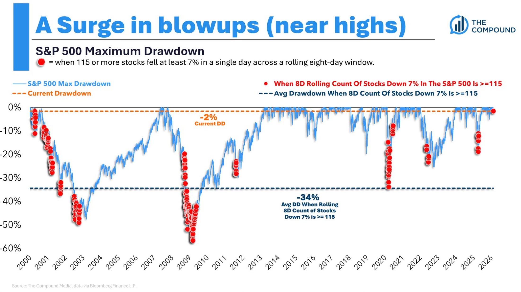 This is extraordinary carnage for individual stocks that’s being masked by the index’s stability. We haven’t seen this kind of single-stock volatility and weakness since the dot-com bubble burst. Historically, when this many stocks experience such severe single day declines in such a short period, the average subsequent market drawdown has been 34%.