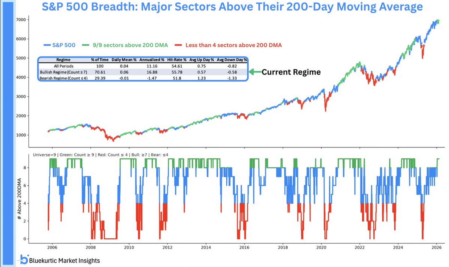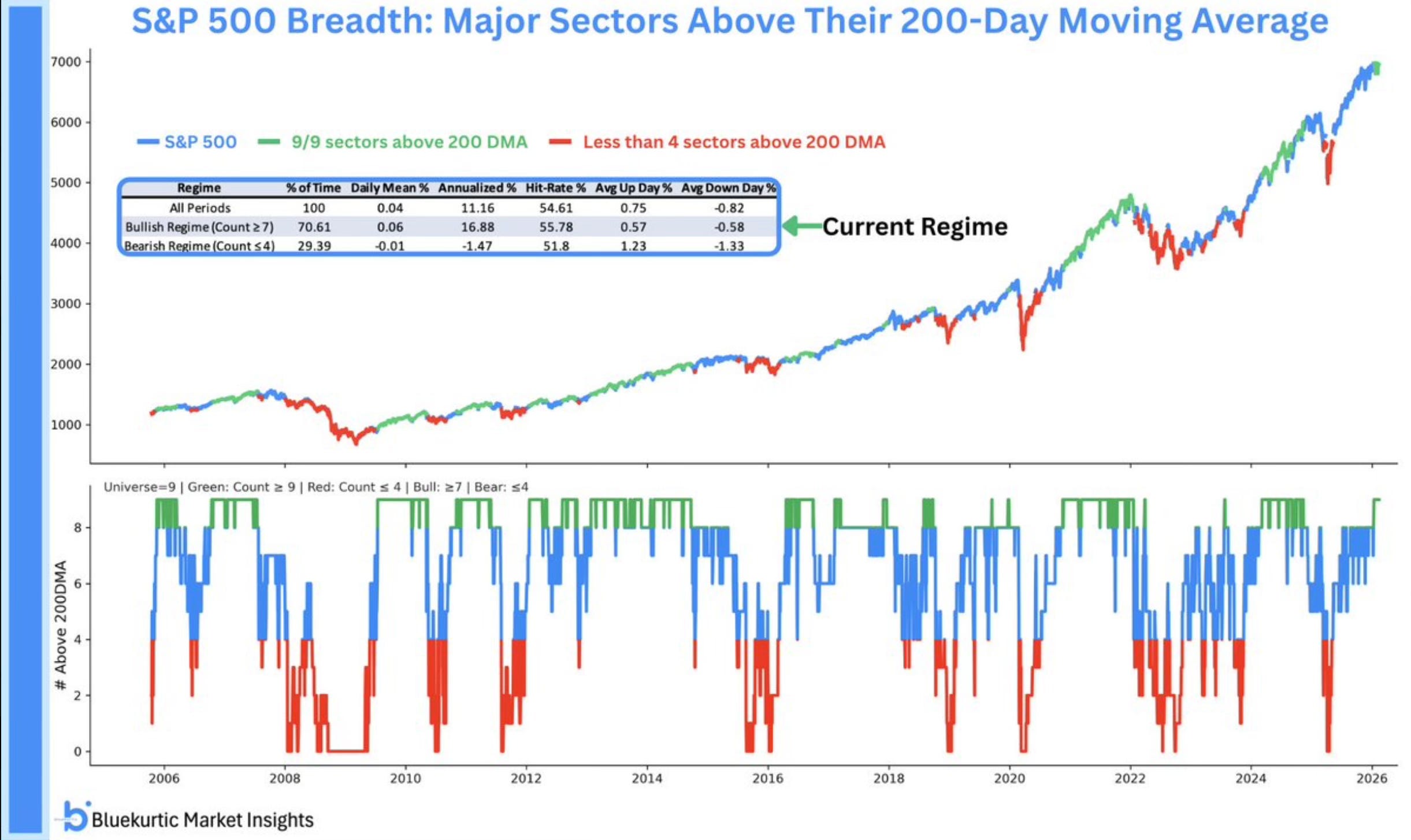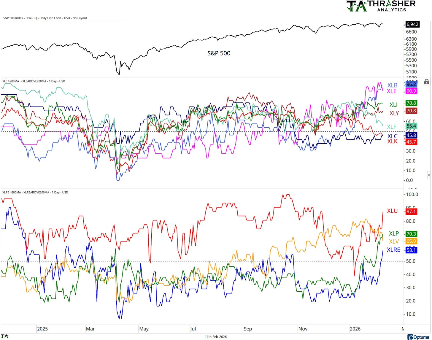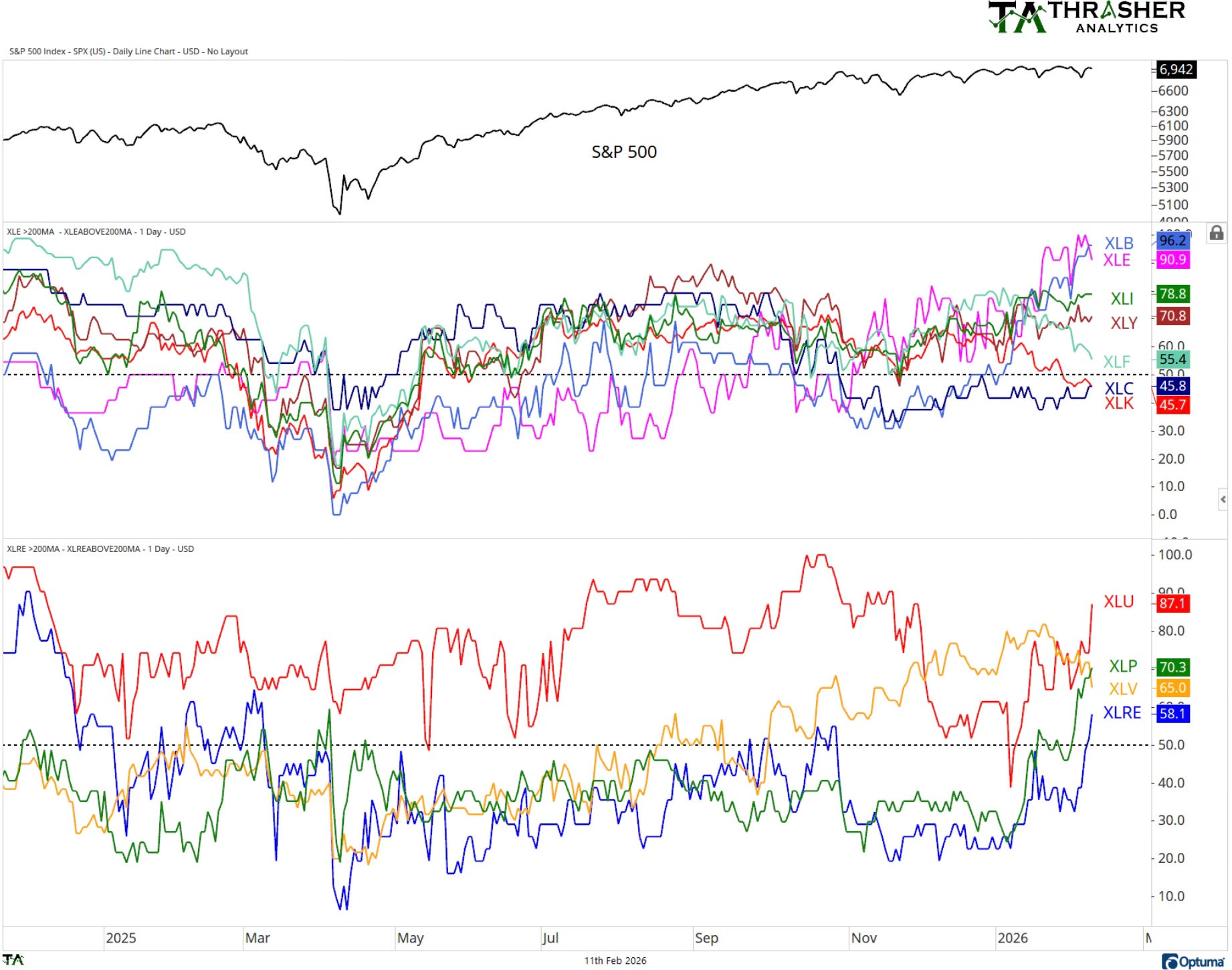 The problem isn’t breadth, it’s what’s leading. While having all sectors above their 200-day moving averages sounds positive, the composition of that leadership raises red flags.