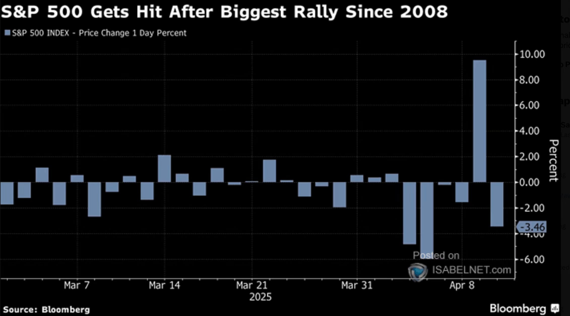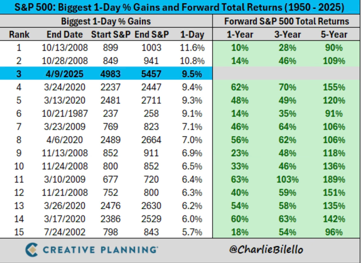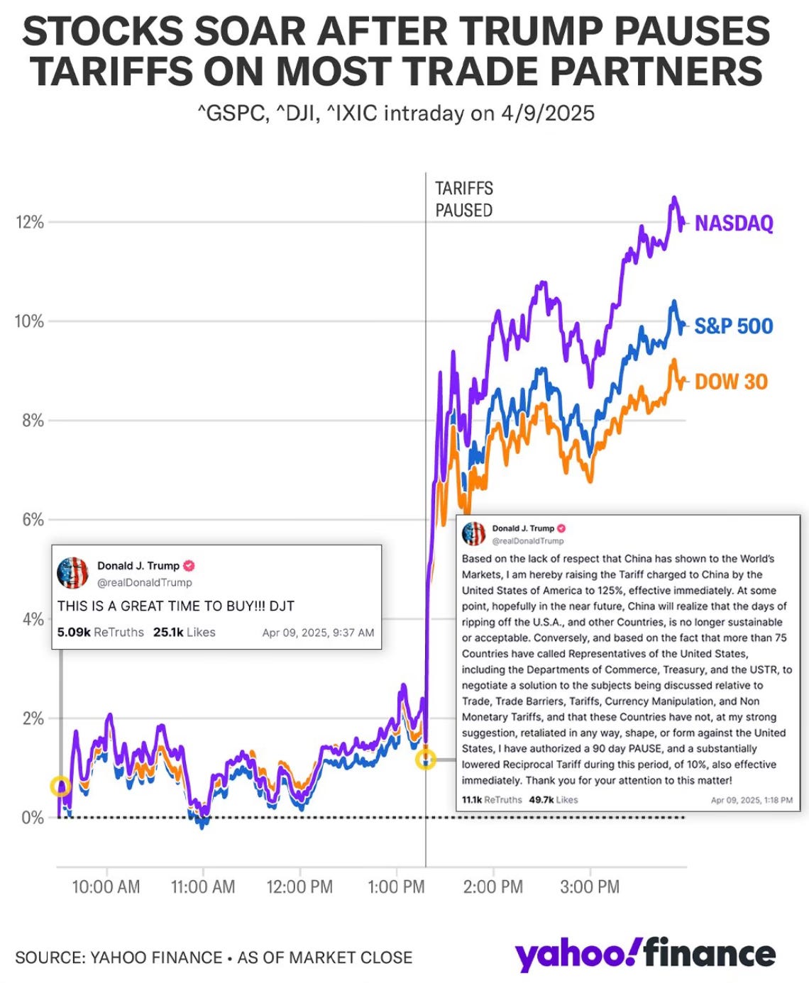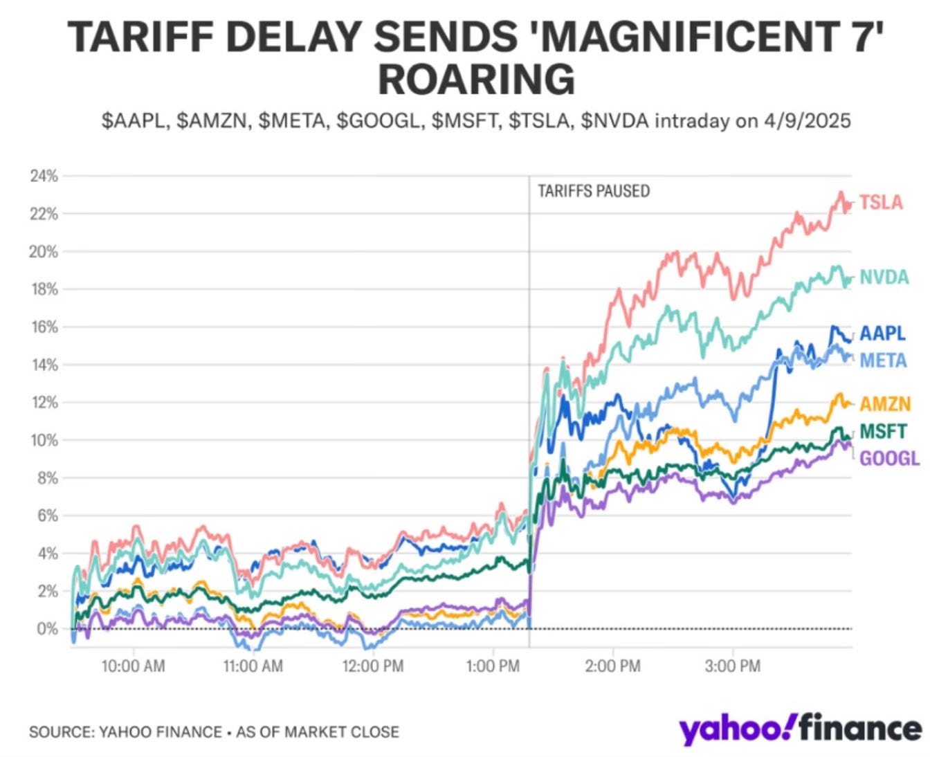Stocks took off after the Trump administration announced a 90-day pause on tariffs. You can see what happened once that was announced.
