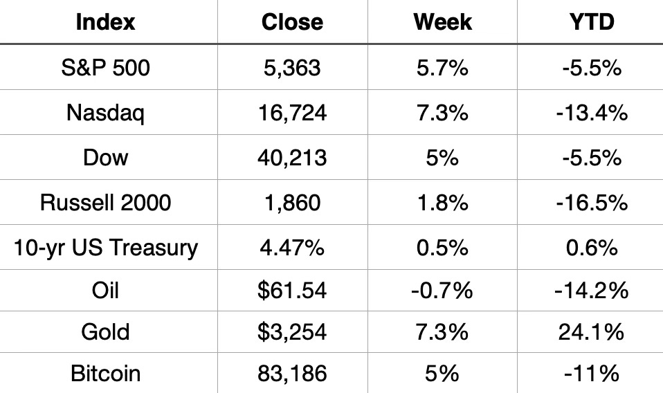 What a whipsaw week. Both the S&P 500 and Nasdaq had their biggest percentage gain since November 2023. It was the biggest week for the Nasdaq since November 2022.