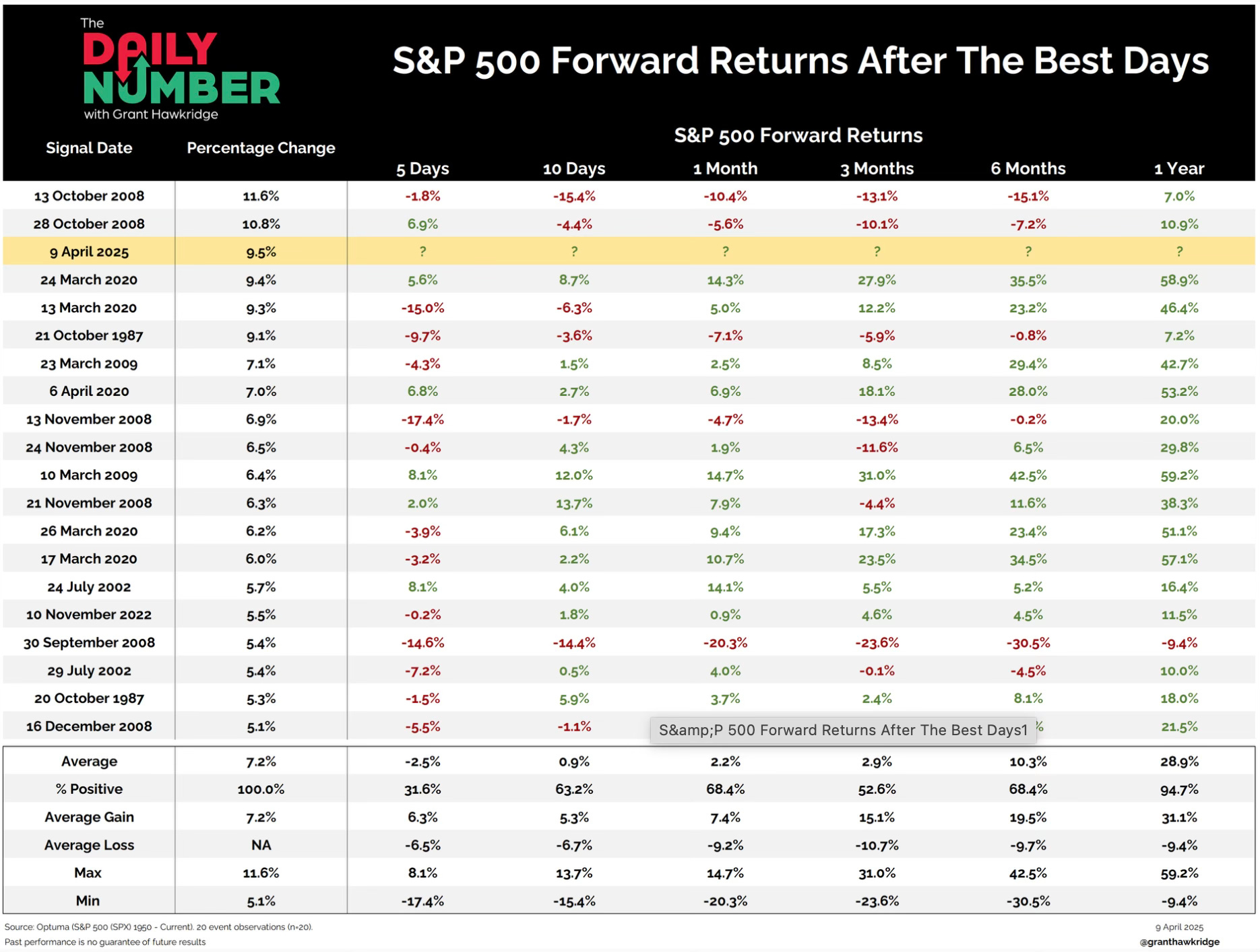 This was an interesting chart from Grant Hawkridge. He shows how the S&P 500 has performed after the best days in history. You can see that following these best days in history, the S&P 500 is up 68% of the time 1 month later and 6 months later. 94% of the time it’s higher 1 year later.