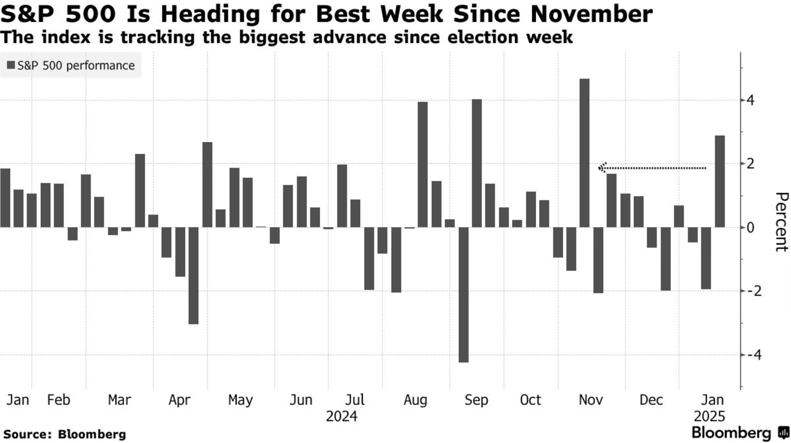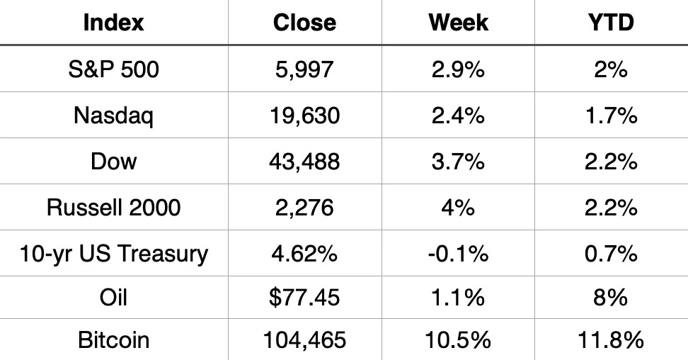 After a couple down weeks the stock market finished with the first positive week in 2025. The S&P 500 finished up 2.9%, the Nasdaq was up 2.4% and the Dow up 3.7%.
