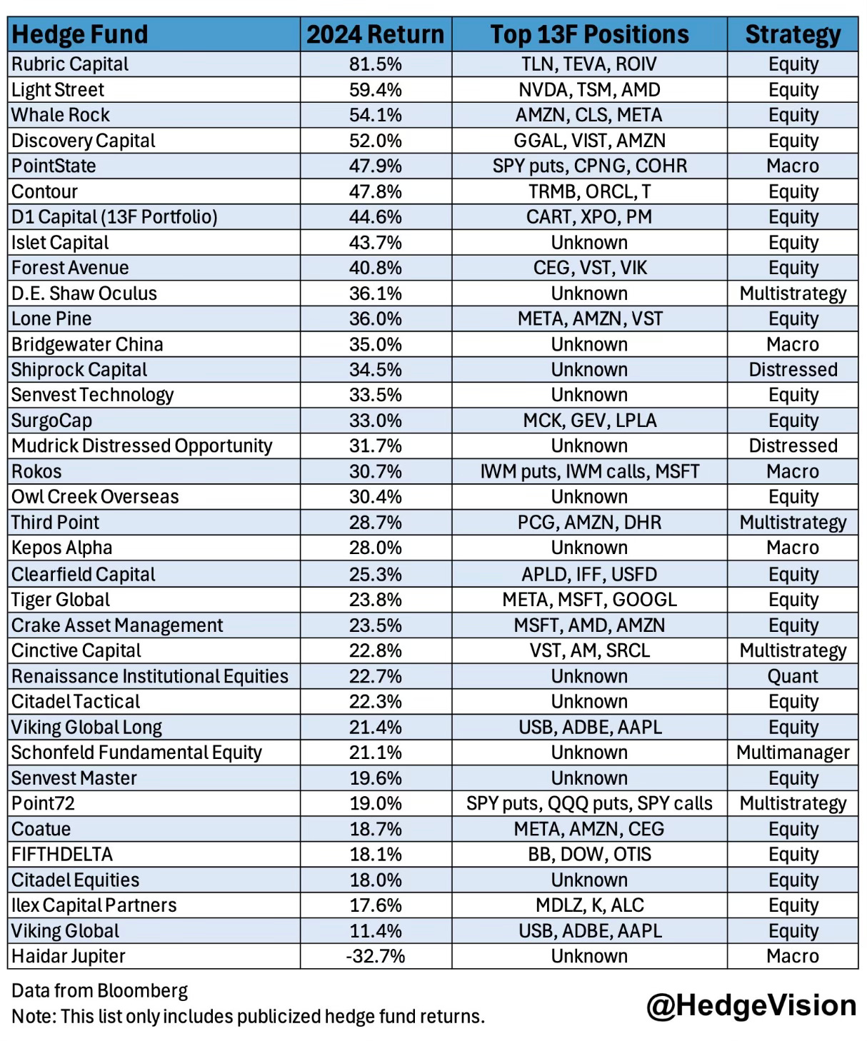 Here is a look at hedge fund returns in 2024. With the S&P 500 up 23.3%, over half the hedge funds on this list beat the S&P 500 in 2024. Overall it was a very good year for hedge funds.