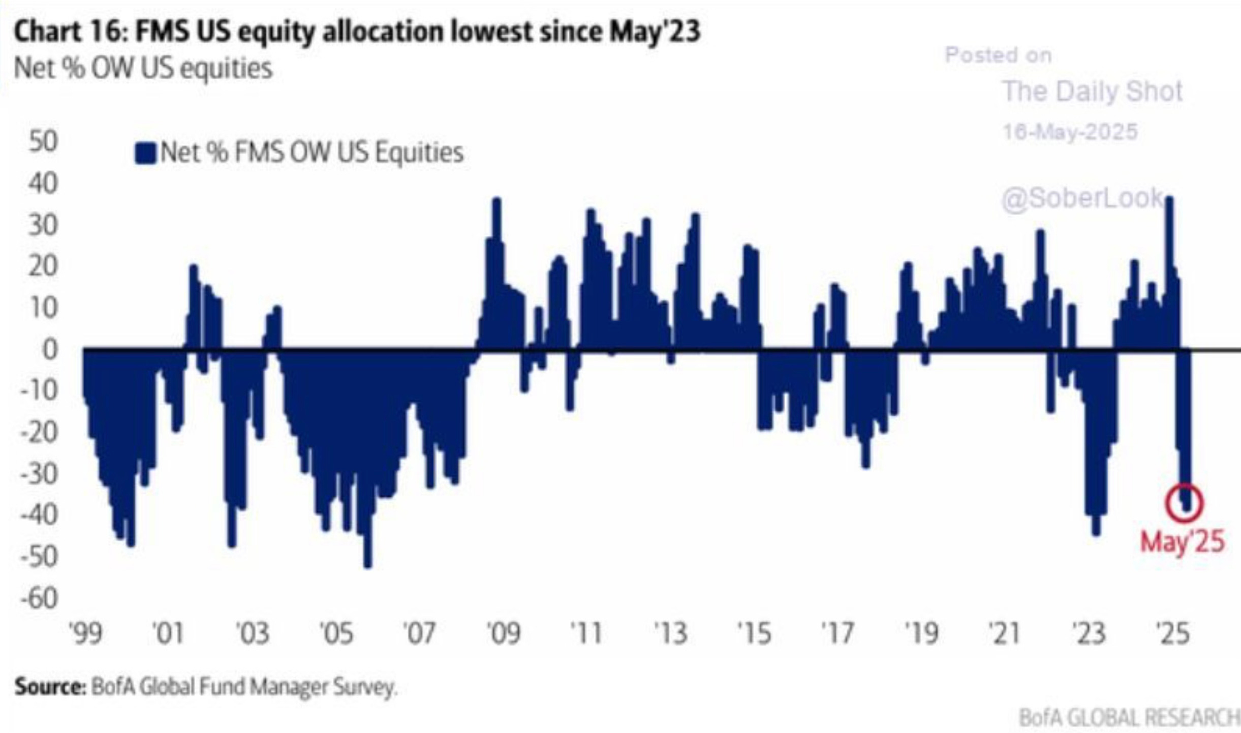 Fund managers are the most underweight equities since May 2023. Even after the recent run, their allocations have not budged.