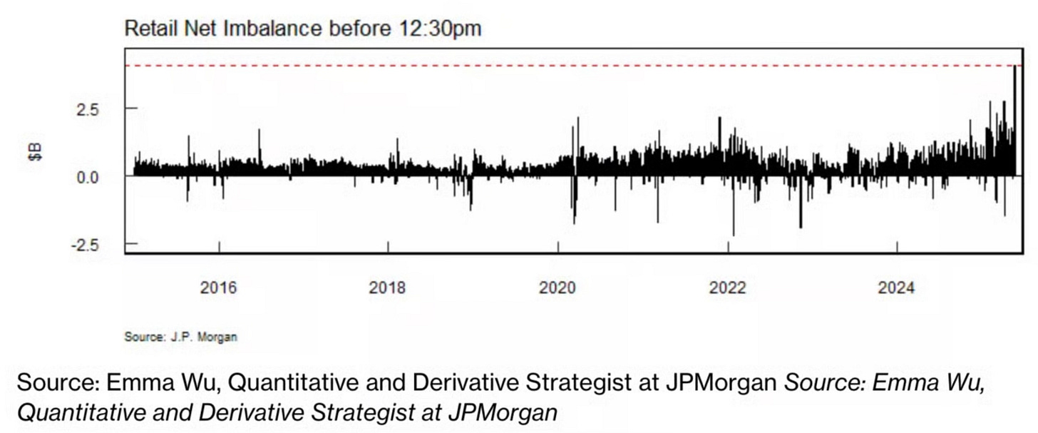 Retail traders went on a record dip buying spree Monday ... Individual investors purchased a net $4.1 billion in US stocks through 12:30 p.m. in New York, the largest level ever for that time of day — and broke the $4 billion threshold by noon for the first time ever.