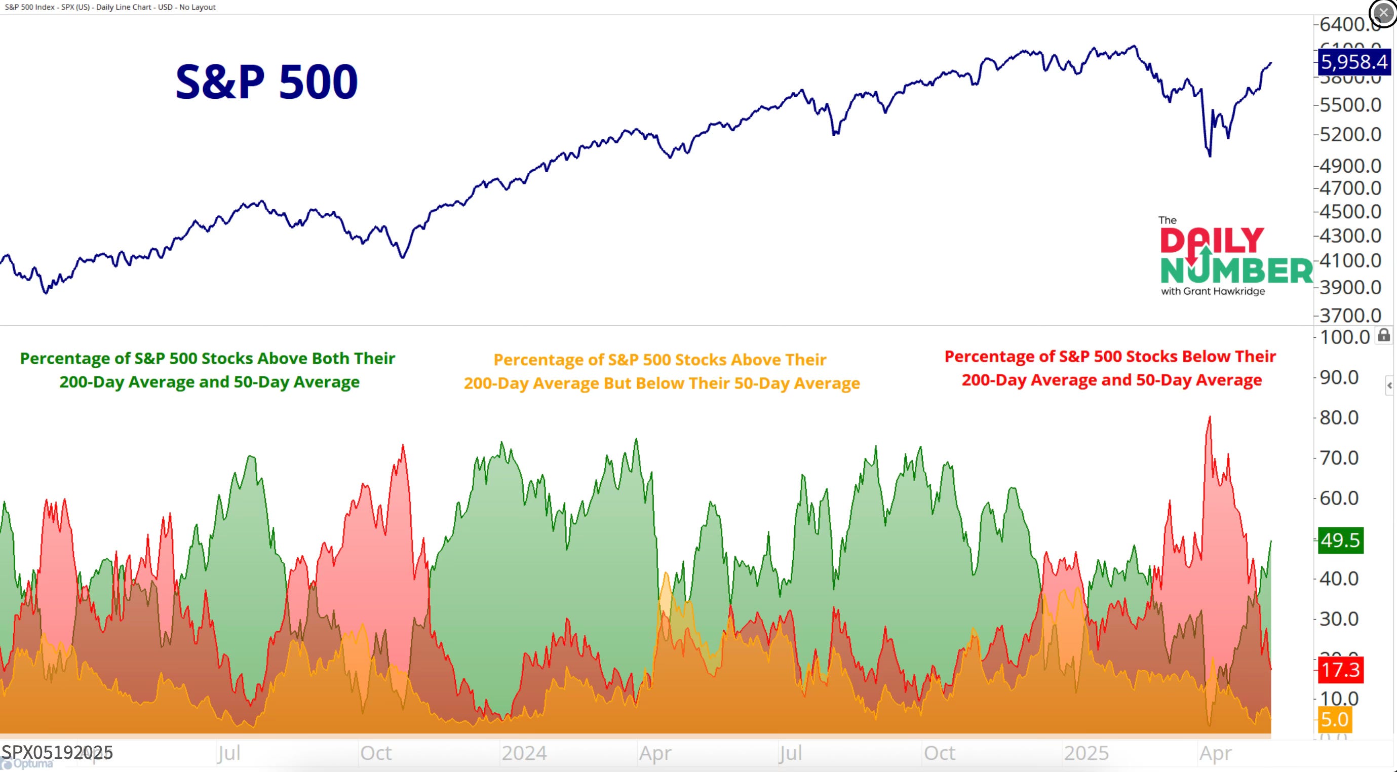 My favorite chart from Grant Hawkridge still shows an increase in the green. I love seeing green as that means the percentage of S&P 500 stocks above both their 200-day and 50-day is rising. Right now that number stands at 50%.