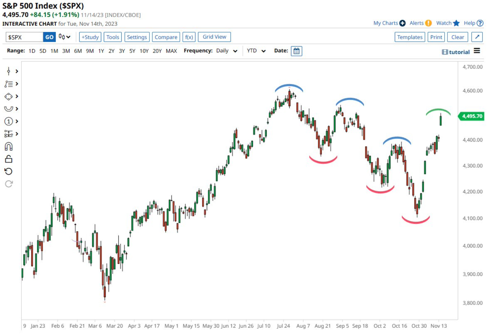 The S&P 500 chart below from Barchart illustrates just that. Lower highs and lower lows sure seem to be in the rearview mirror.