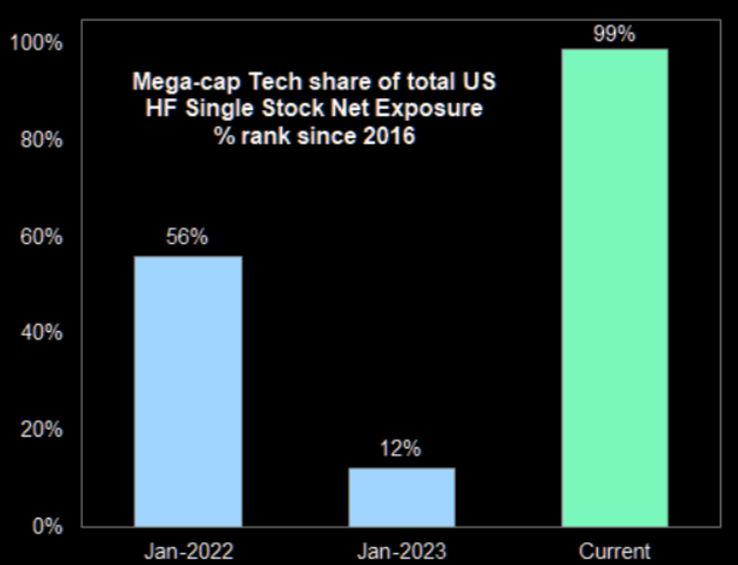 What is surprising is how quickly hedge funds switched their exposure in mega-cap tech stocks. To start 2023 the exposure was in the 12th percentile. Today it sits in the 99th percentile. That the highest net exposure since 2016.