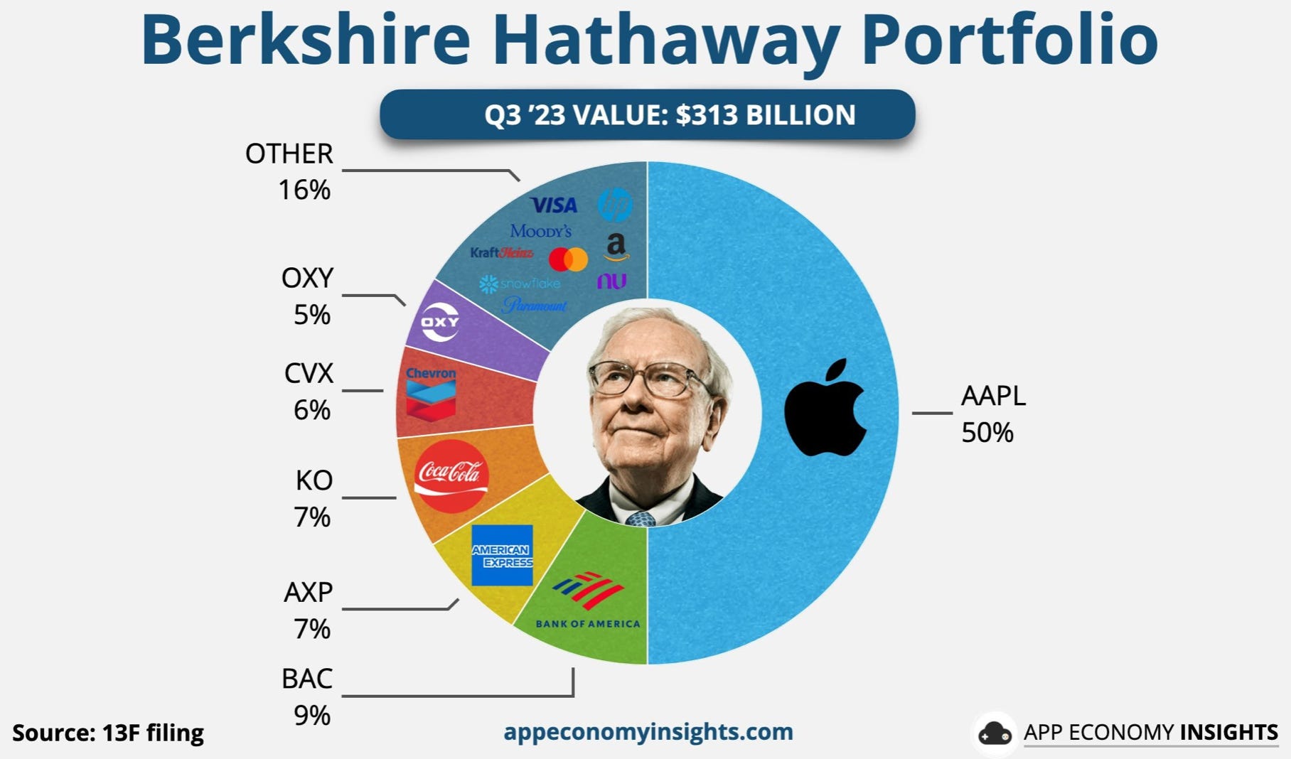 The most watched 13F filing every quarter is Warren Buffett and Berkshire Hathaway. Here is a picture breaking down what the current holdings and percentage weighting in Berkshire.