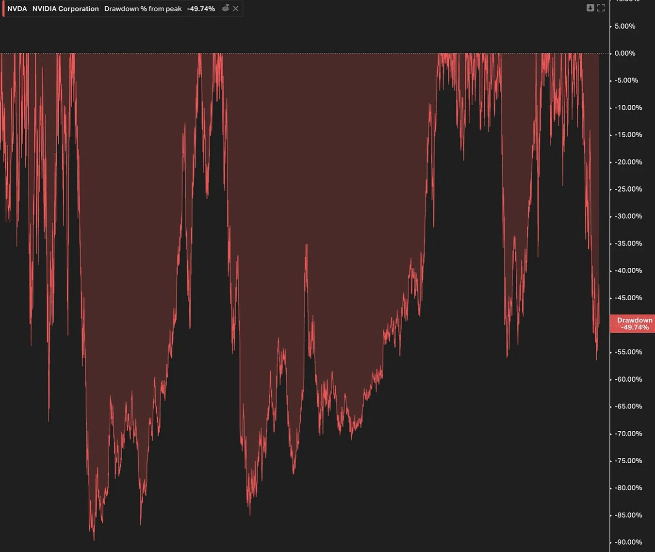 Nvidia has traditionally been a very volatile stock. This is a chart of the drawdowns in the stock since 1999 when it came public.
