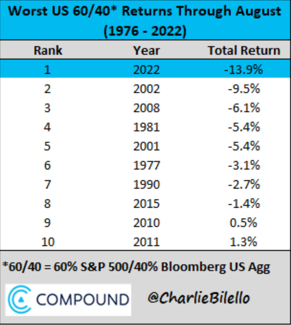 How about if you have a traditional 60/40 (60% stocks & 40% bonds) portfolio? That has seen the worst start since 1976.