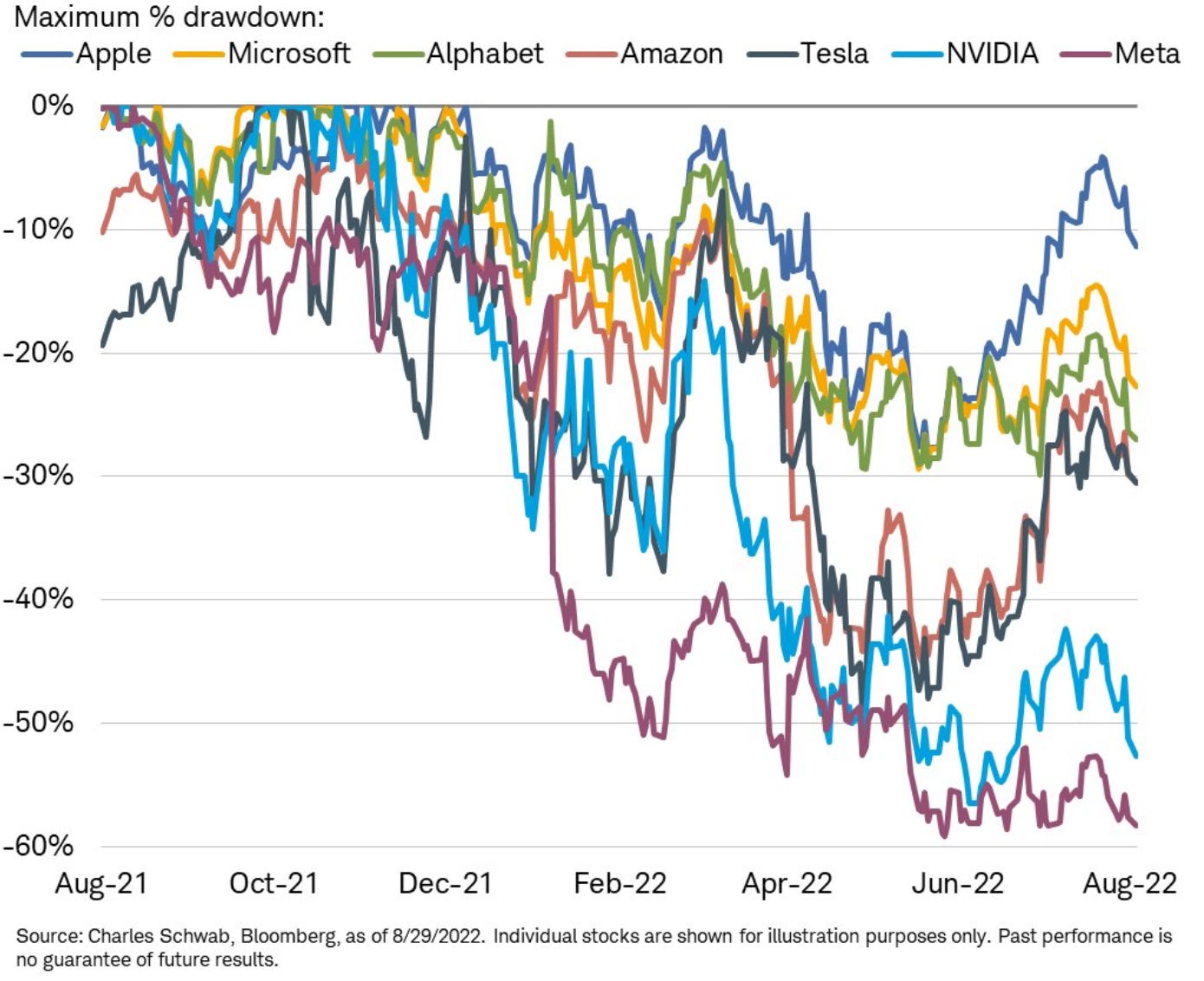 With a long-term time horizon the 7 mega-cap tech names are a good place to start looking. As you can see the drawdowns in these companies is steep. But 1, 3, 5, or 10 years from now, how many of these companies will be worth more than they are today? That’s how I’m viewing the market and individual stocks.