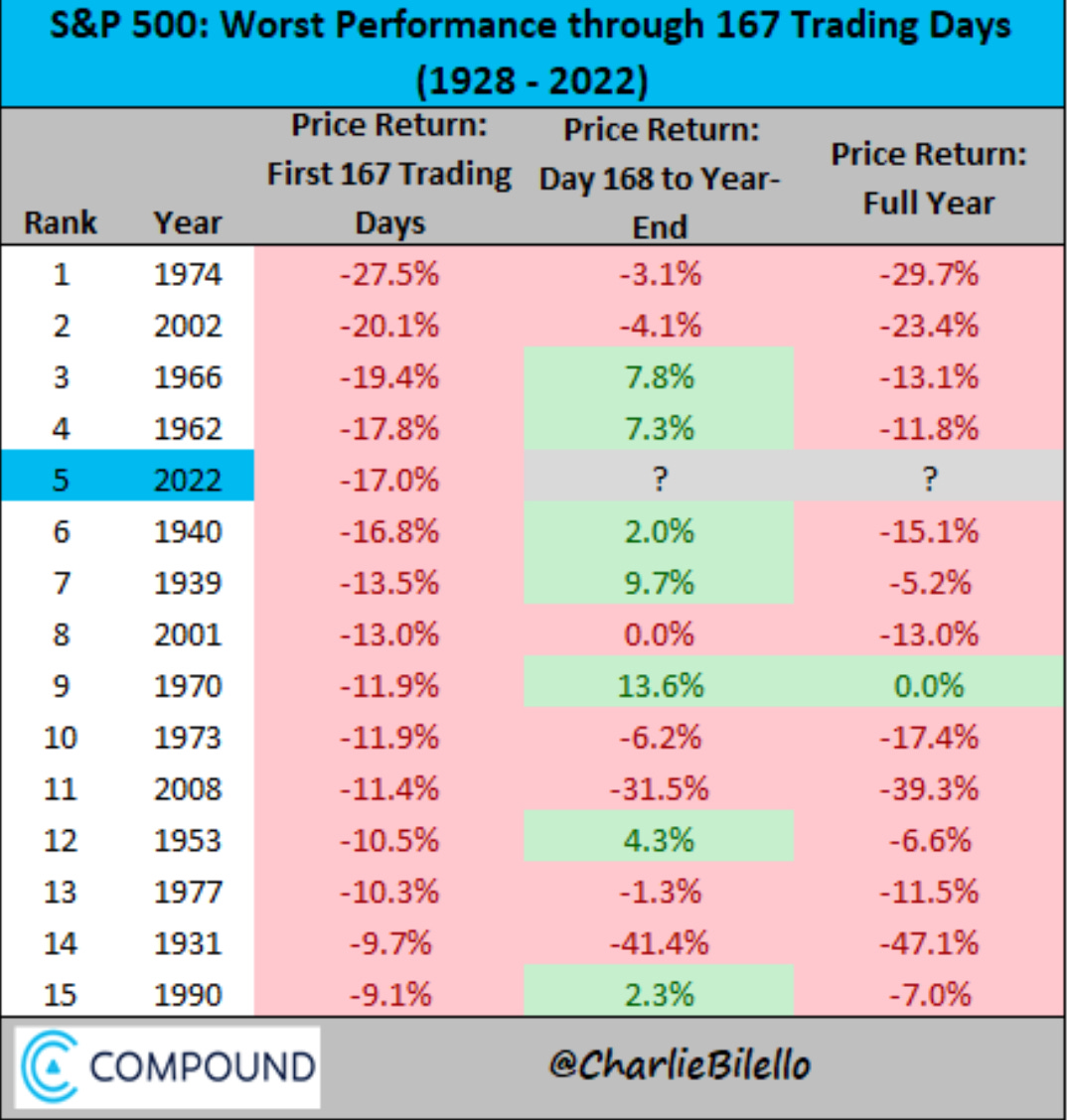 We’ve now been below the 200-day average for 102 days and counting. As the chart below shows, the S&P 500 is in the midst of the 5th worst year through eight months in history.