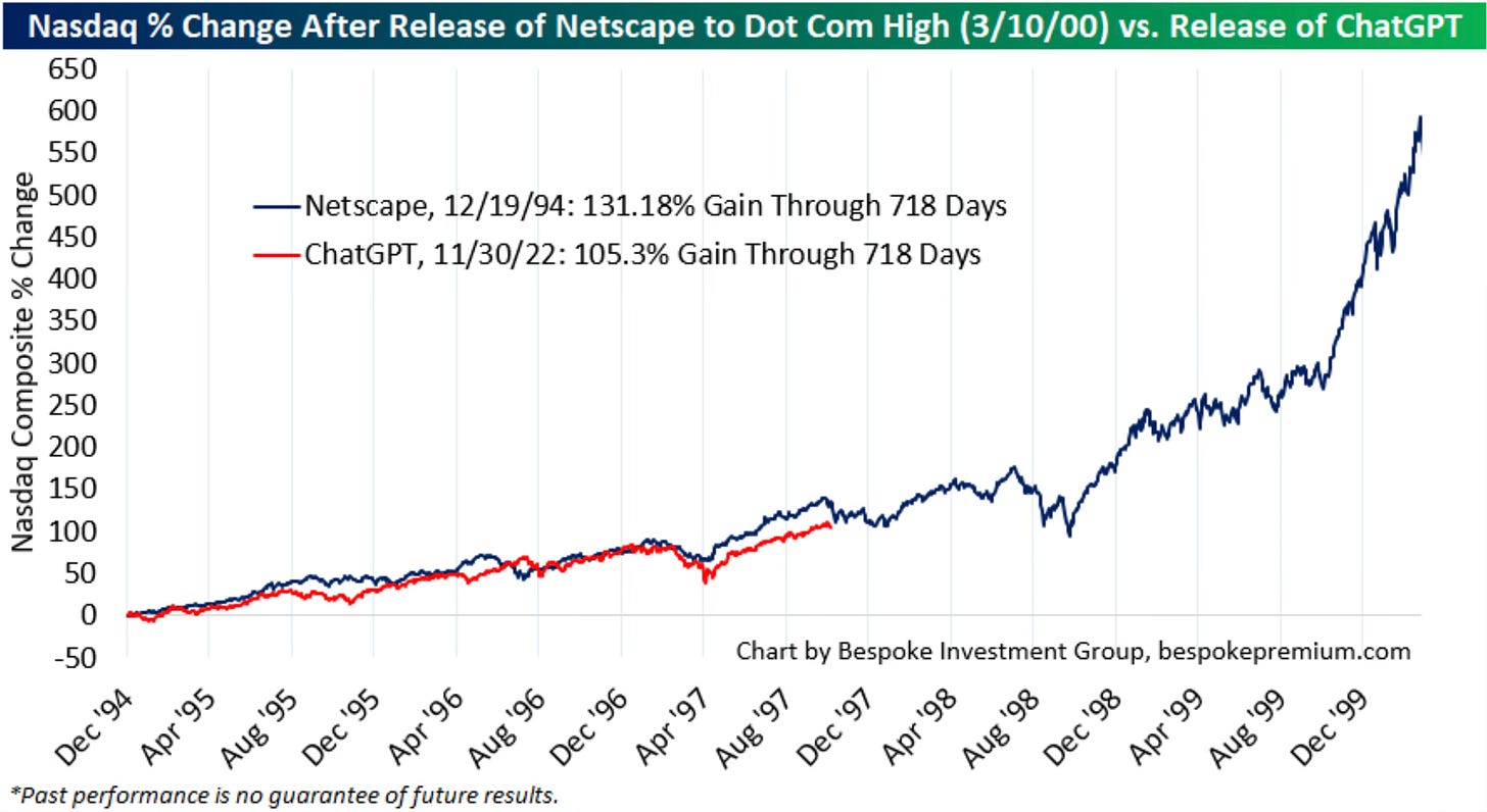 I have to periodically check in to see if this wild chart that compares the release of Netscape during the dot-com frenzy to the release of ChatGPT. The Nasdaq is still tracking almost identically at this point through 718 days.