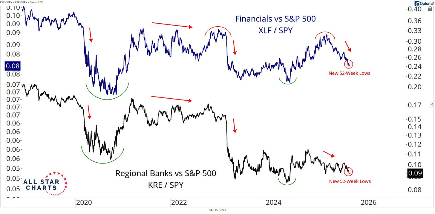 Regionals banks and financials just hit new 52-week lows relative to the S&P 500.