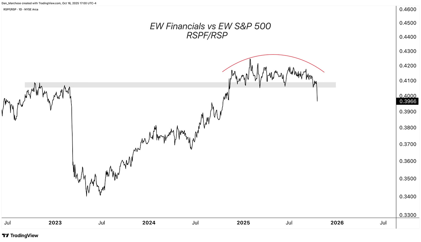 Are financials trying tell us something? Take a look at the equal weight financials vs the equal weight S&P 500.