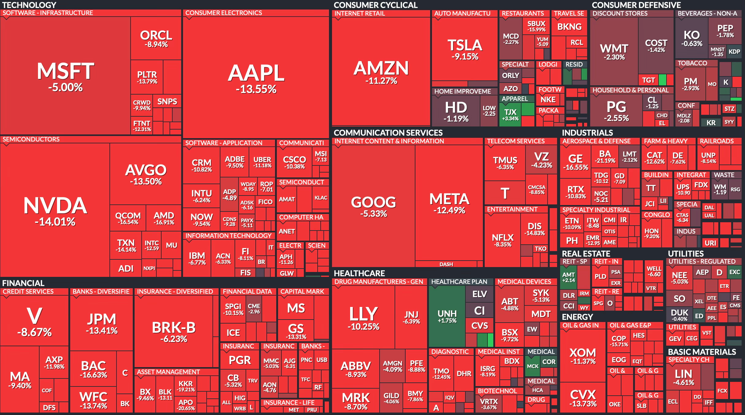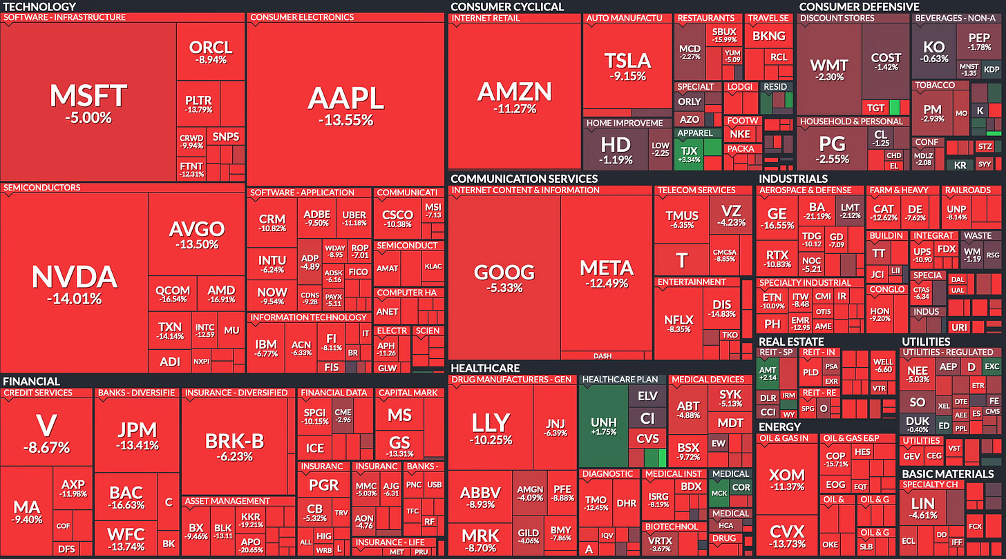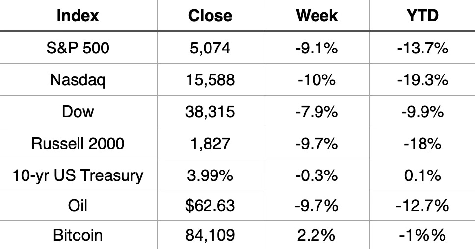 The week ended with the S&P 500 falling 9.1%. The Nasdaq fell 10% and the Dow was down 9.9%.