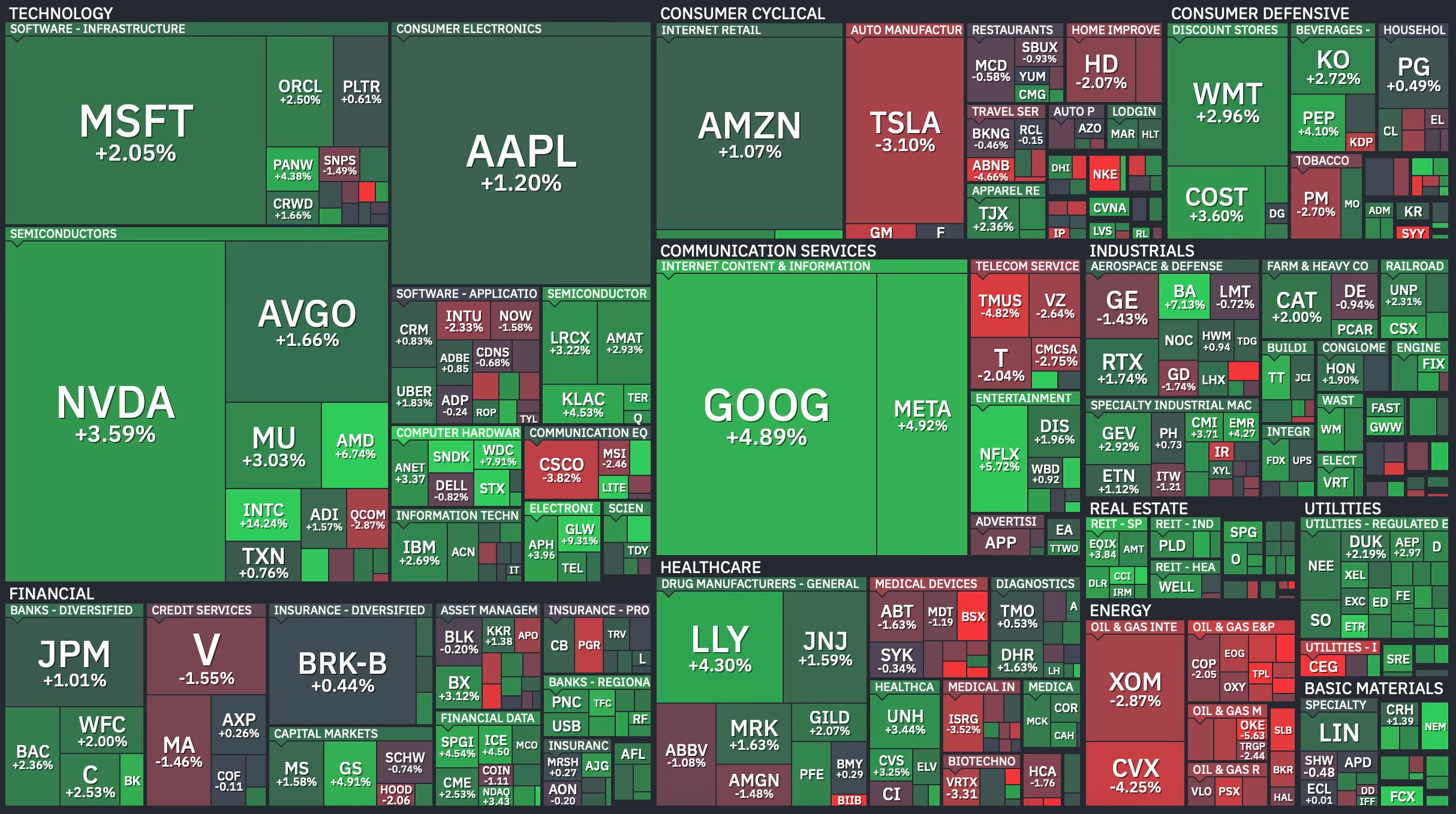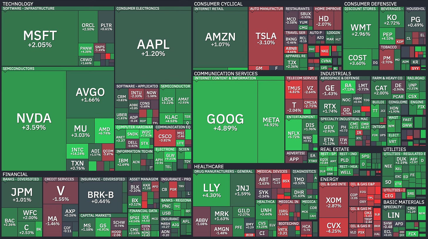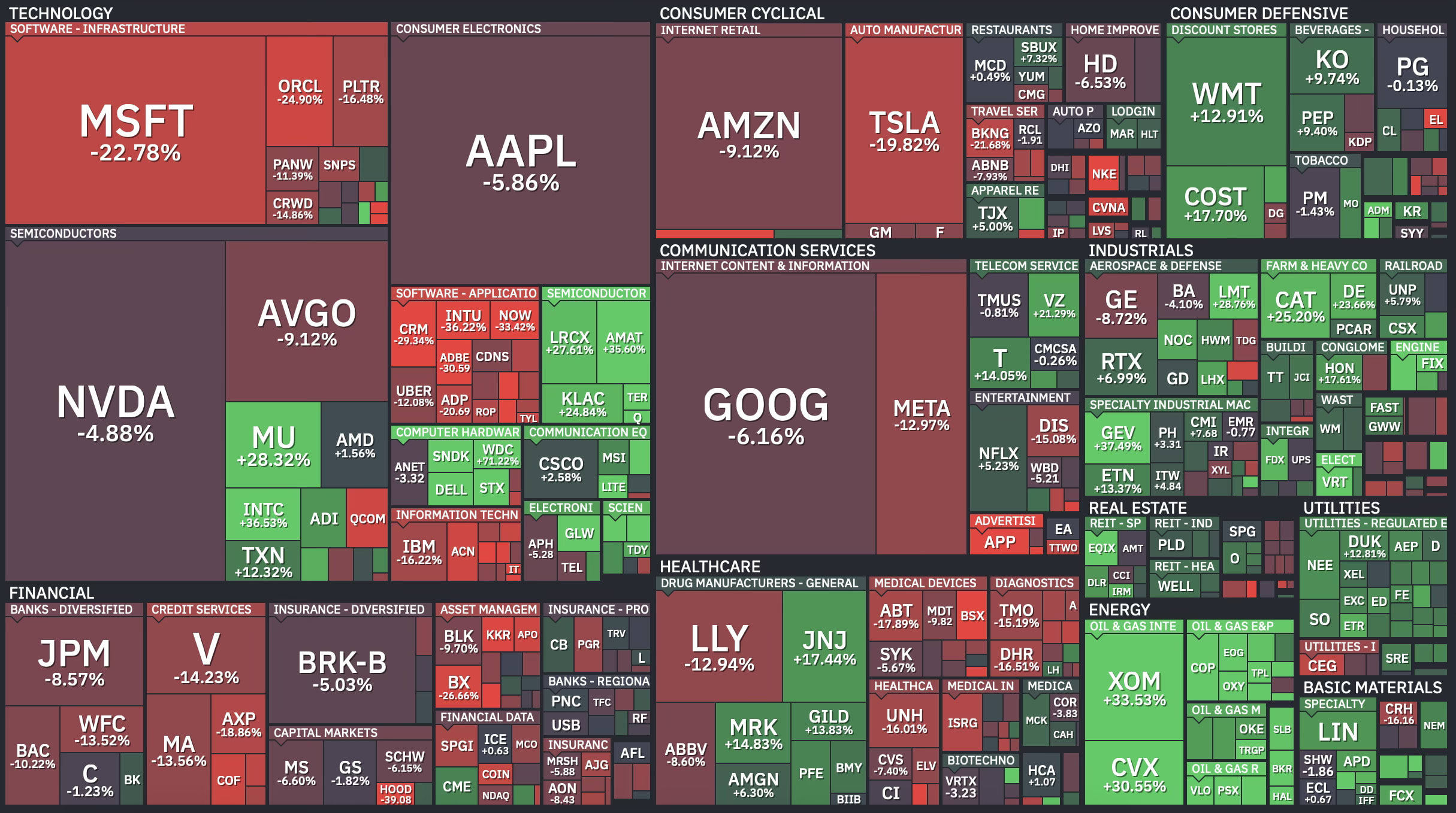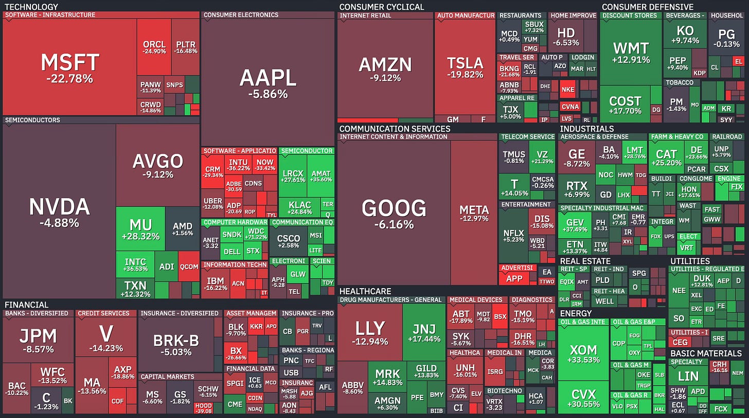 Here’s what the damage looked like at the sector level. Energy was the clear standout. Everything else was mostly red.