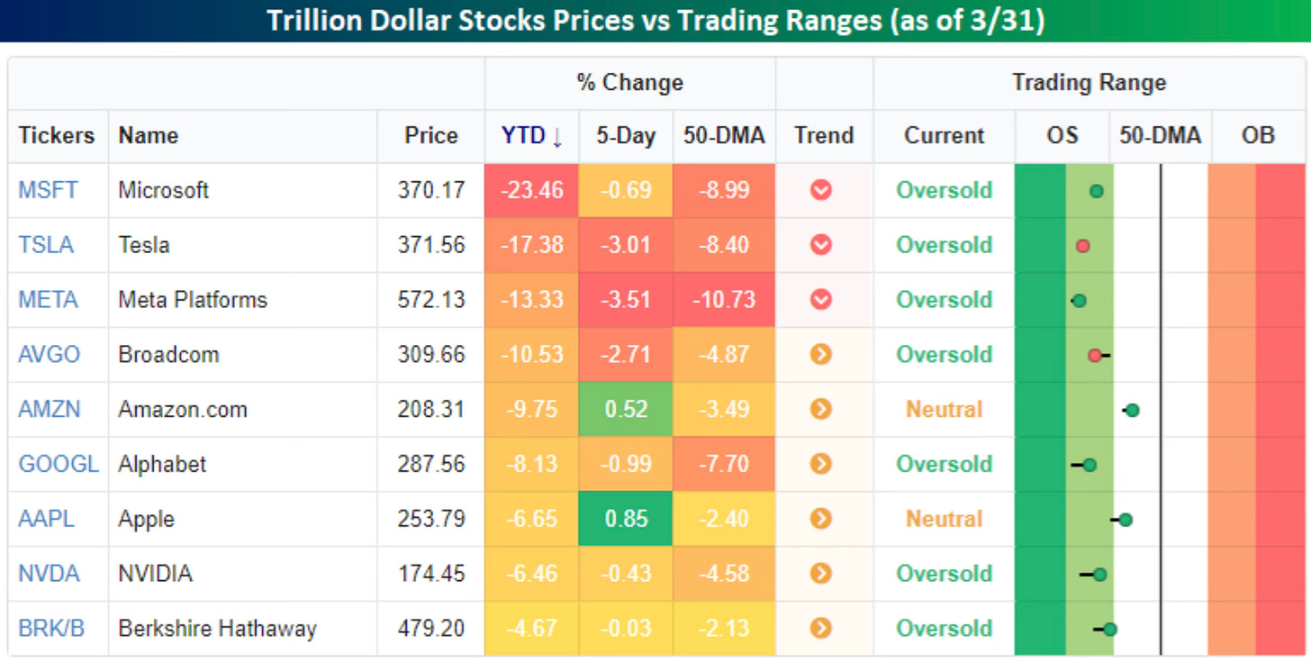 The megacaps didn’t just underperform the market. They led it lower. Microsoft is down more than 23% year-to-date. Tesla is off nearly 17%. Every name on this list is in the red. Most of them are sitting in oversold territory.