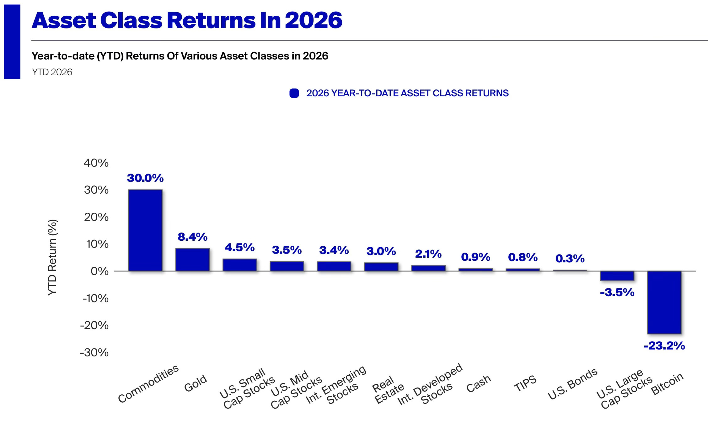 If you had told investors in January that bitcoin would be the single worst-performing asset class by the end of March, most would have laughed. But here we are. Bitcoin dropped more than 23% while commodities ripped 30%. Large-cap U.S. stocks weren’t far behind bitcoin on the losers list. That’s not a lineup many saw coming.