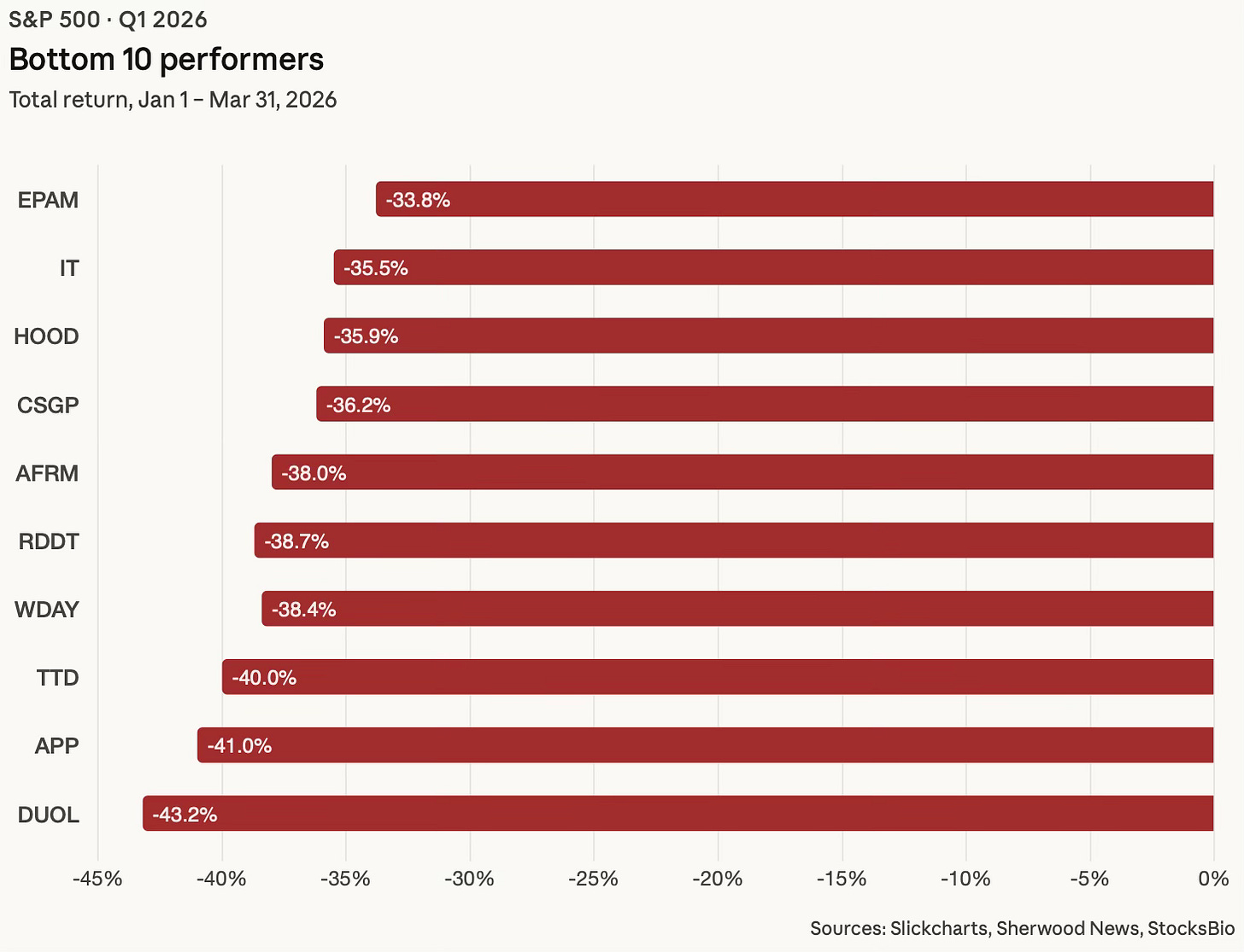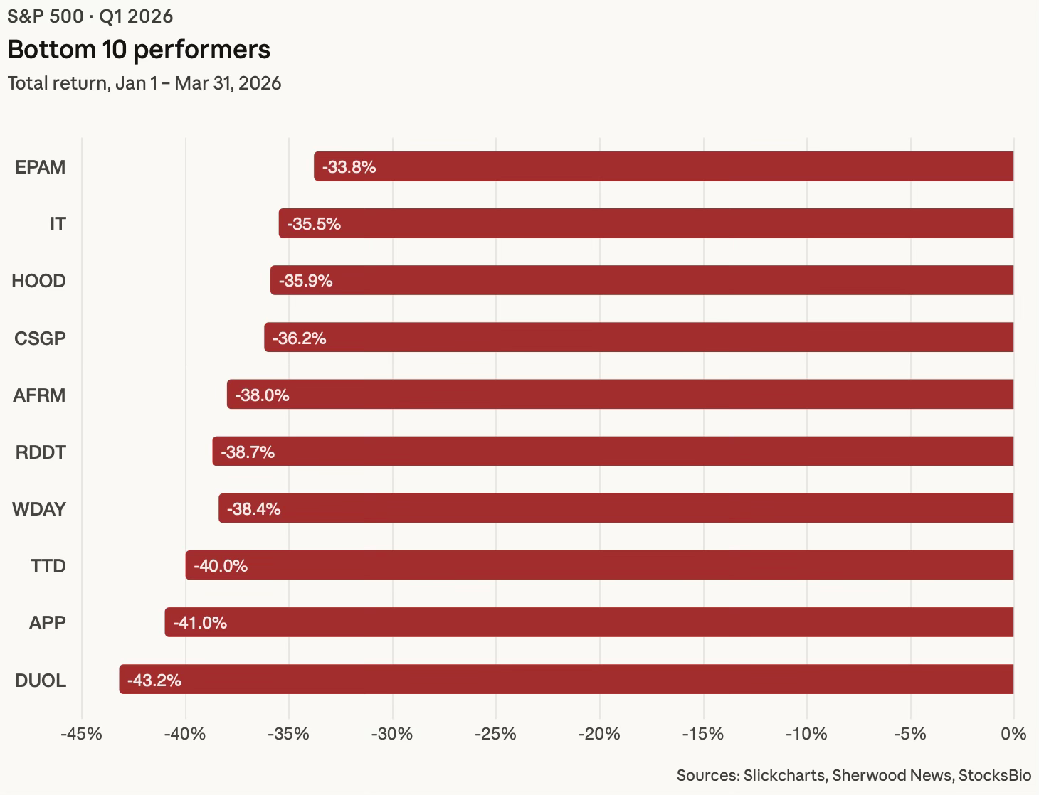 That fear alone crushed some of the biggest names from 2025. Software companies made up more than half of the bottom 20 performers in Q1. Trade Desk dropped 40%. Workday fell 38%. Adobe was off 31%. Salesforce down 30%. AppLovin, which surged 108% in 2025, was the single worst performer in the index this quarter, falling 41%.