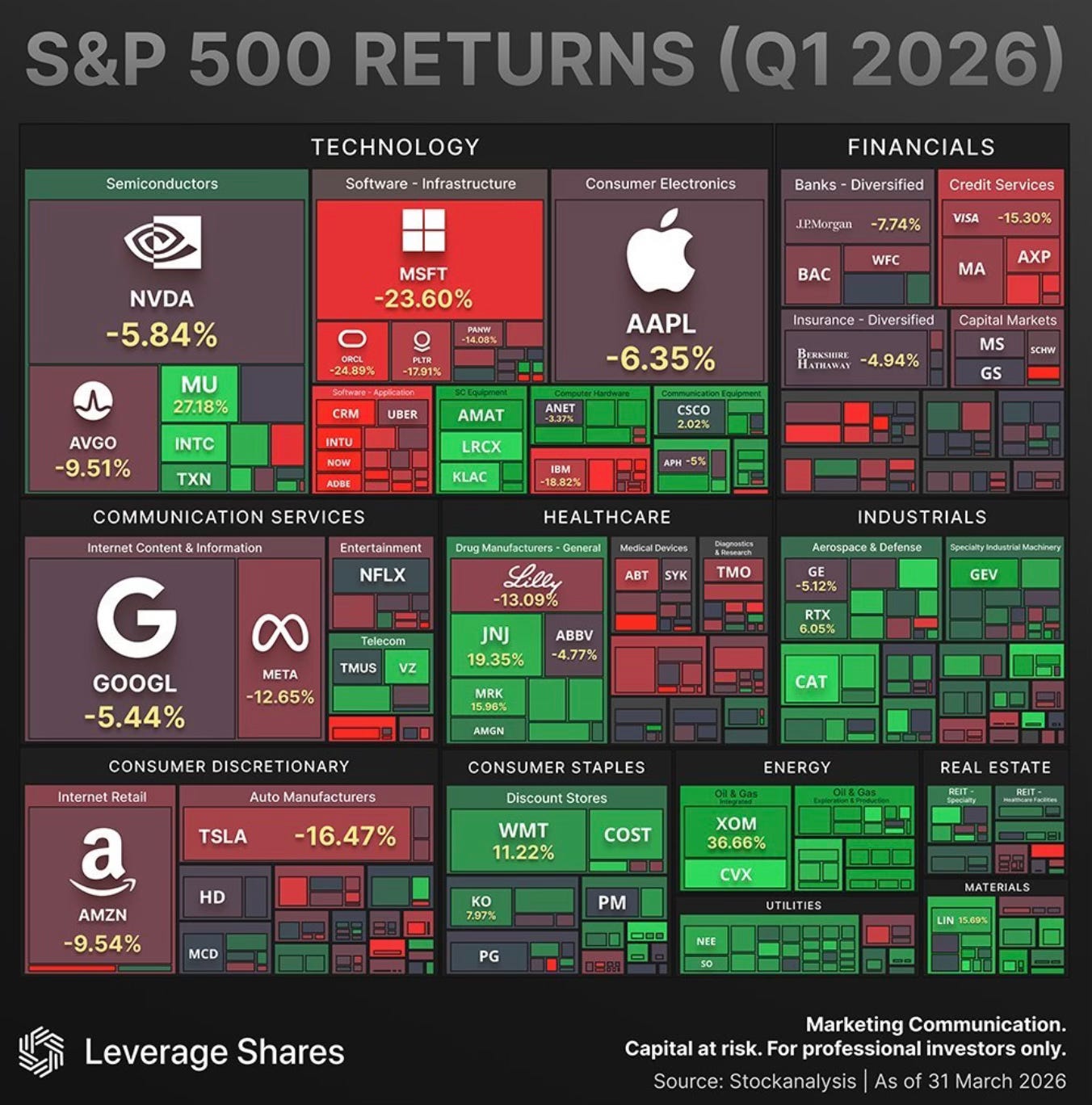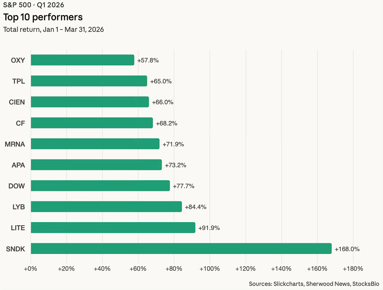 Sandisk finished Q1 up 168%. It topped the entire S&P 500 in 2025 at +559%, and it’s apparently trying to do it again. No stock has ever topped the index back-to-back. It’s fueled by hyperscaler demand for flash storage in AI data centers. The broader memory and optical group followed its lead. Lumentum was up 92%. Ciena up 66%. Western Digital up 57%.